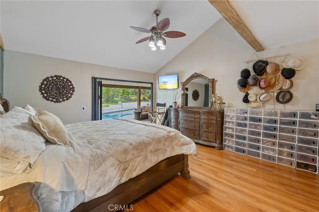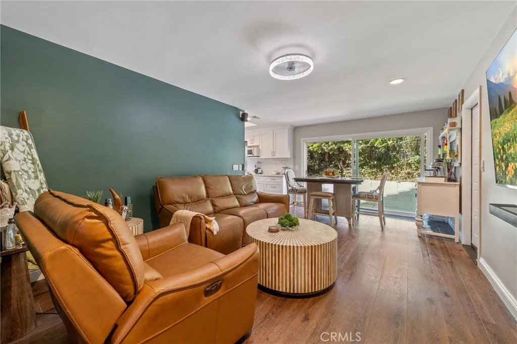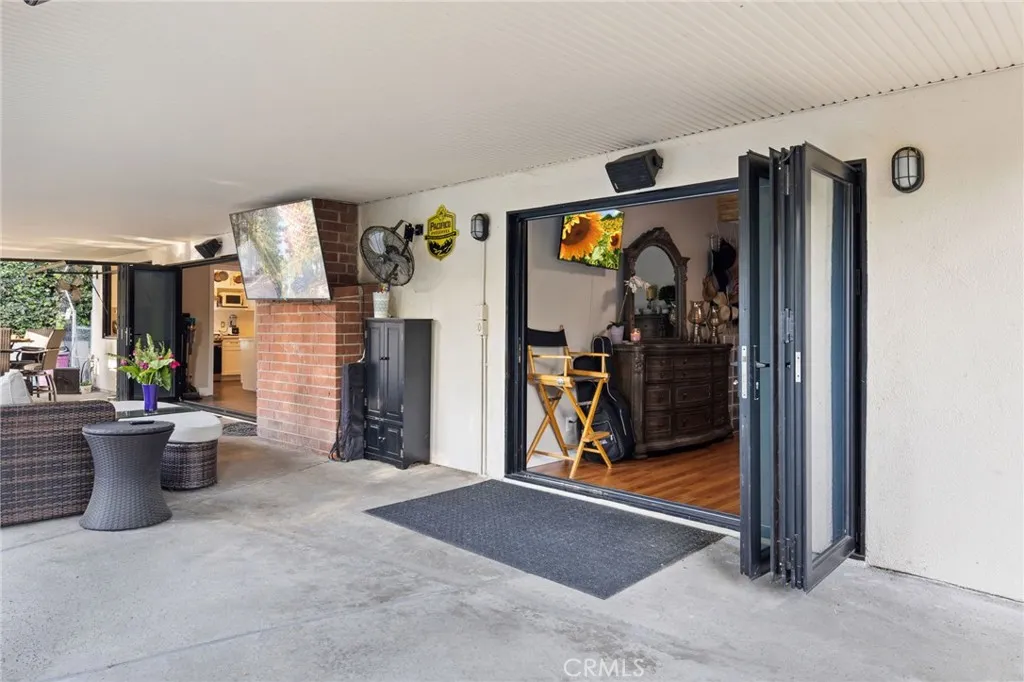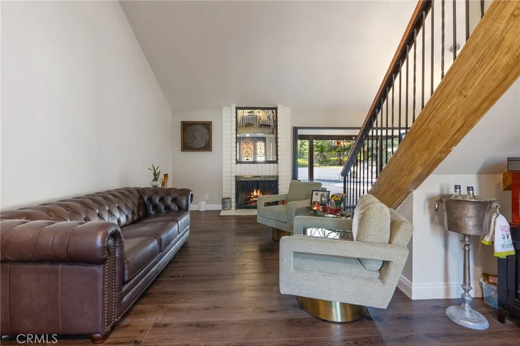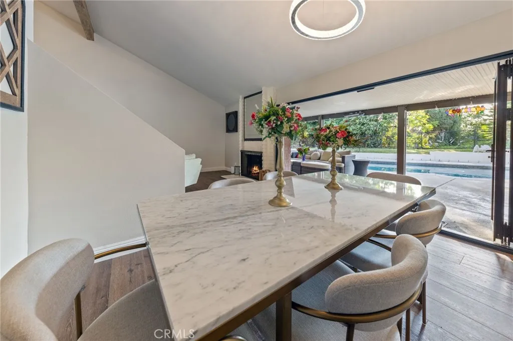 From the moment you step through the custom wrought-iron double doors, you’re greeted by soaring vaulted ceilings, rich wood-look flooring, and an abundance of natural light pouring through oversized windows and accordion-style folding doors that open to your private backyard oasis. The open-concept living room features a white brick fireplace as its centerpiece, with views that draw you straight to the patio and pool.