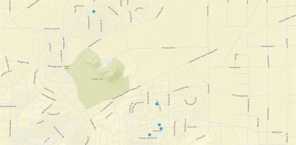 Twenty Mule Team pkwy to Bucknell. Bucknell to rice, to Bersal, to Happy Hour Dr. Buckwell Rd to Rice, Bucknell to Lipari E Dr to Romeo. Ransburg to Bucknell to Claremont to El Bolero to Munivez to Hansen St.