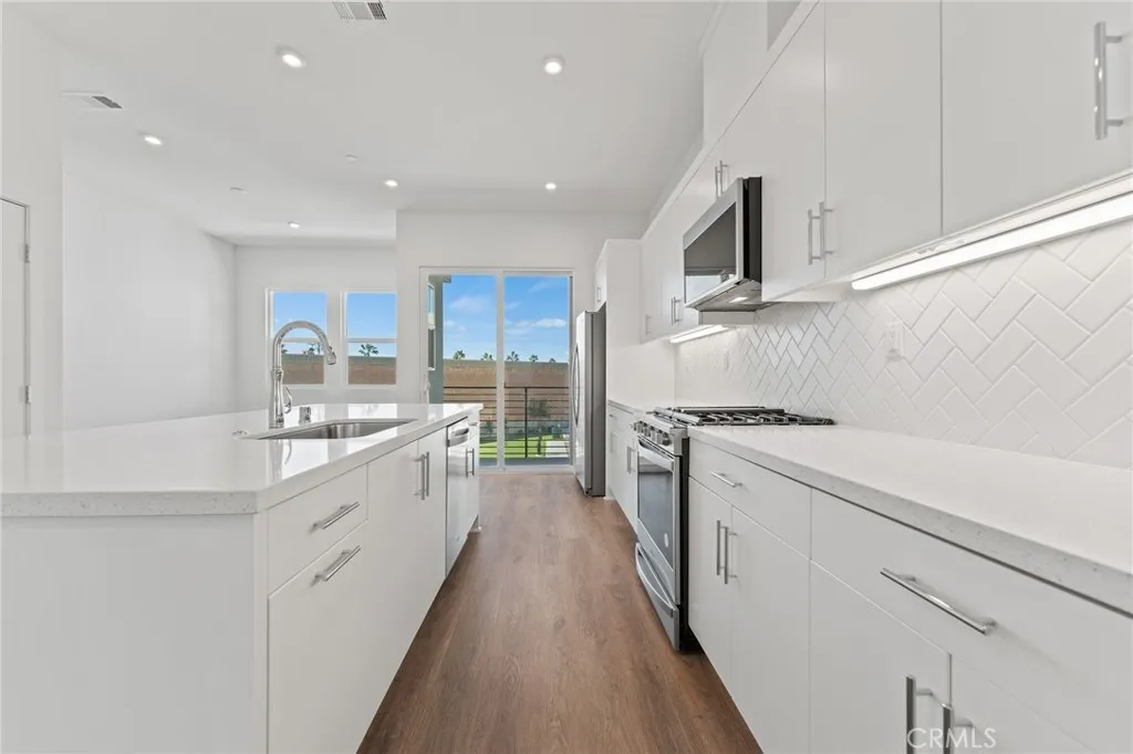 Located within the desirable, gated 100 West community built by renowned builder Toll Brothers is a four story home that boasts modern designs. First level consists of a downstairs bedroom and bathroom. Main level holds the open concept living area. Kitchen is complete with gorgeous white cabinetry and center island. Two patios on the main level allow for an enhanced indoor/outdoor flow. Third level features the luxurious master suite as well as remaining bedrooms. Windows throughout allow for sunlight to pour in, bringing in a plethora of natural lighting. Residing on the upmost level is a roof top deck that is perfect for entertaining guests. Additional highlights include two car garage, gated community, and many more. Centrally located within the heart of Orange County, this home is minutes away from Disneyland, Angels Stadium, Honda Center, shopping, and dining. This home allows for the lively Anaheim lifestyle, all while offering both comfort and convenience.