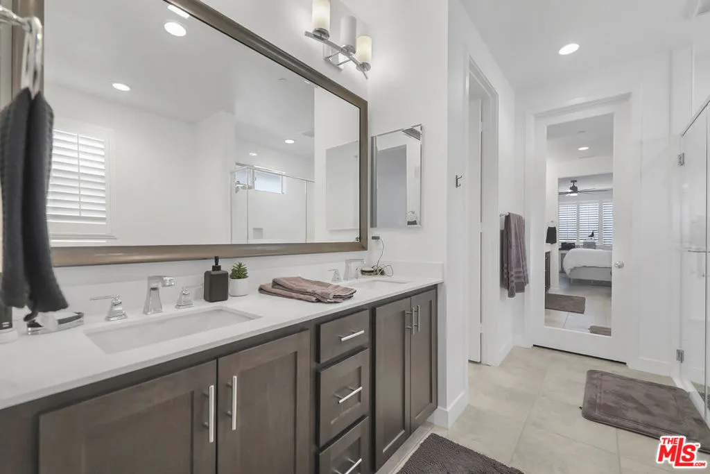 This contemporary home boasts over 2400 square feet of Luxurious living space. It’s the perfect blend of Modern and Elegance and Eco-Friendly features. This popular plan 5 model is situated in the very desireable “Sage” community in a pristine and quiet location. The chef inspired kitchen is the Centerpiece of this beautiful home and features an impressive 50 square foot island with seating for six. A spacious great room with Custom shelving and Custom stone decorative fireplace, and dining room flow effortlessly out to an oversized covered patio and private backyard. This well planned floor plan features first floor dual primary suites, each with beautiful ensuite baths. A separate first floor powder room, sizeable laundry room and abundant storage space allow for ease of living. The second floor is bright and airy and includes two additional bedrooms providing extra space for guests. Both bedrooms enjoy easy access to a well appointed full bath. Attractive finishes include Quartz surfaces, stylish backsplash accents, custom shutters and so much more. Eco-friendly features include OWNED solar panels, tankless water heater and energy efficient Milgard windows. Conveniently located near shopping, dining, and major highway routes. This home offers the perfect balance of tranquility and accessibility. Sage residents enjoy resort style living that includes a gated entry system, refreshing pool, club house, fully stocked gym and yoga lawn.