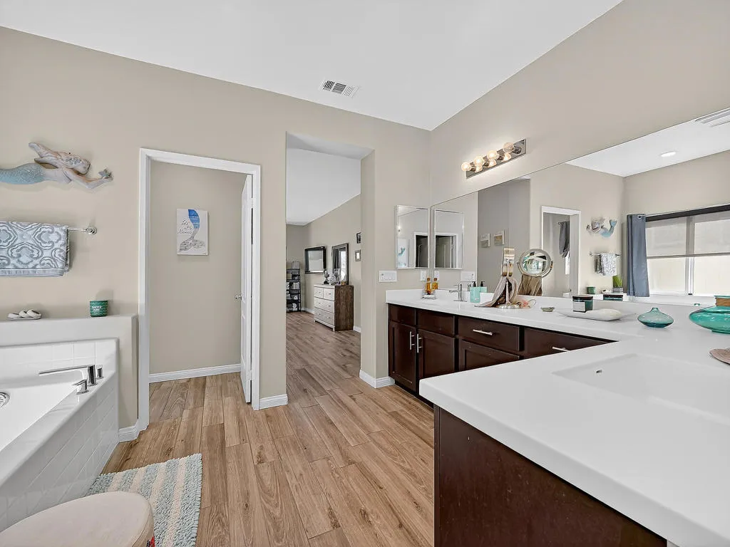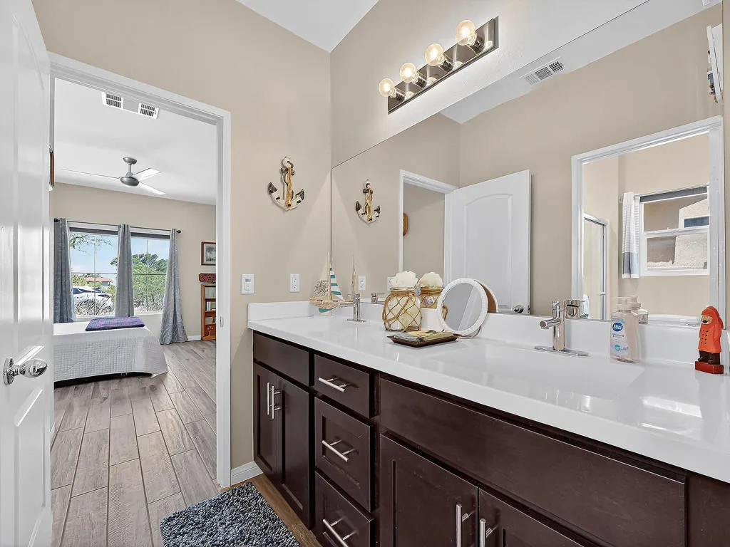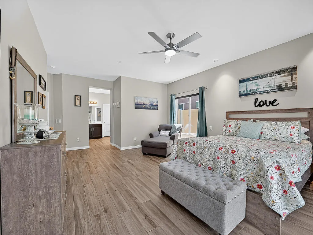 LOW INTEREST ASSUMABLE LOAN at 3.125% option on this 2018 custom built home in gated community. Golf access at Mission Lakes Country Club, Over $38,000 in BUILDER UPGRADES. 6’x36′ ceramic tile flooring throughout, all grey color. Large bedrooms, hallways and Great room!Built-in wine refrigerator and pot filler over stove in kitchen. Custom kitchen cabinets with back lighting and upgraded counter tops.Shows like a model home. Easy access with highly sought after floor plan.Original Owners.Must see to appreciate!