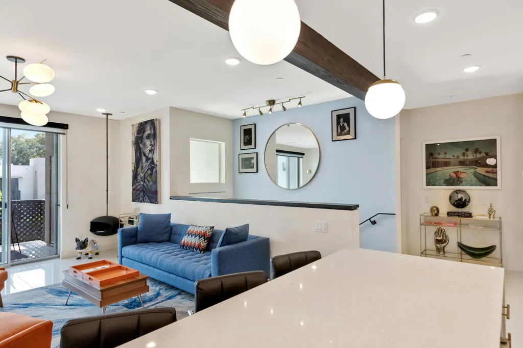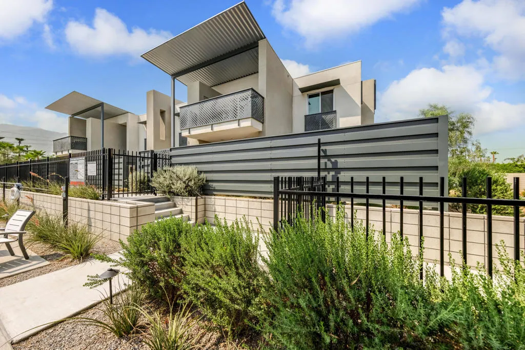 LITERALLY THE BEST VIEW AT 64@THE RIV! Beautiful 2 bed 2 bath condo right in the center of Palm Springs! One of the best locations within the community, this upper level FULLY FURNISHED poolside condo is filled with custom details, including a cool Jetson style suspended fireplace, a wine fridge, custom gold hardware and tremendous mountain views to the south and west from every room and the balcony! Also includes full solar for super low electric bills. 64@The Riv is a gated community located in the Uptown Design District of Palm Springs, and close to tons of cool restaurants and shops. Some additional features are open concept living area, 9′ ceilings with exposed beam, 8′ tall sliders onto patio, clerestory windows, quartz countertops and backsplash, custom cabinetry, private community dog park, community electric car charging stations, and a 60′ resort stye pool and fireside seating area.