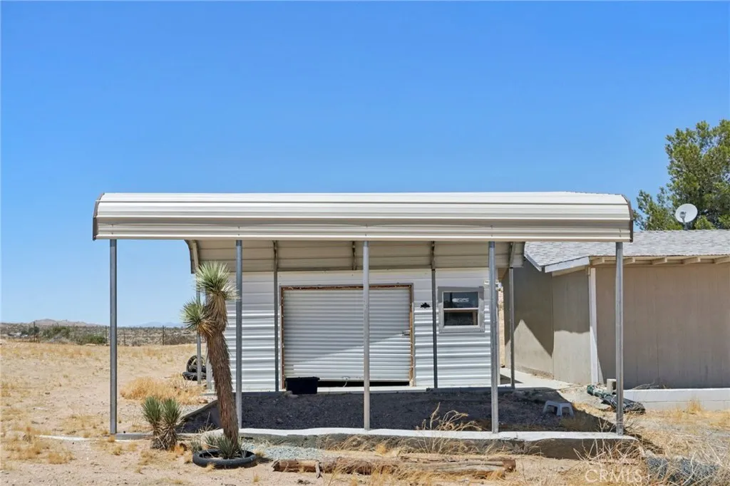 Exterior features include two carports, a detached garage with electrical on a concrete pad, multiple storage sheds, and drought-tolerant natural landscaping.
