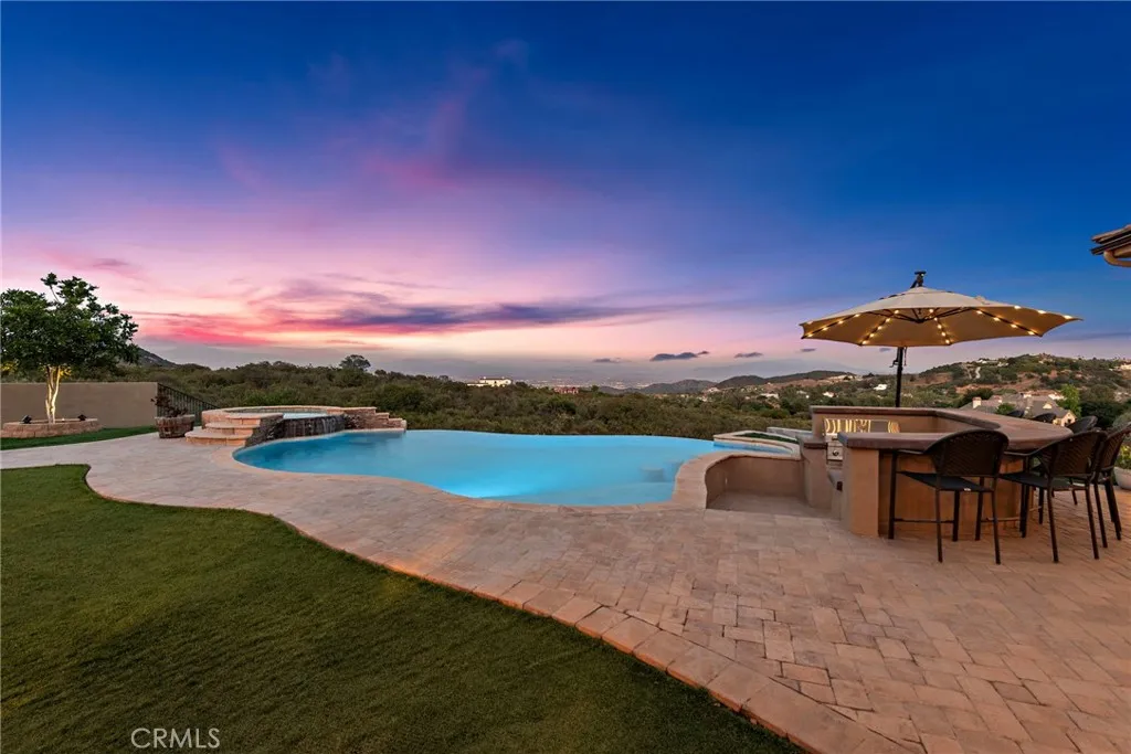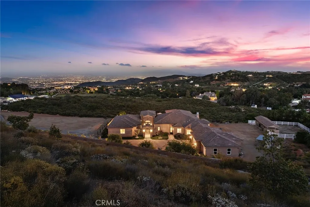 Welcome to 38150 Vía Huerta, a private, resort-style retreat nestled in the sought-after La Cresta community of Murrieta. Situated on 5 pristine acres with panoramic views of the mountains and city lights, this exceptional horse property offers the perfect blend of luxury, comfort, and functionality. From the moment you arrive, a gated entry and long, scenic driveway set the tone for the peaceful elegance that awaits. Inside, the home is filled with natural light and soaring ceilings that create a spacious, airy feel. Large picture windows frame breathtaking views and invite the outdoors in, while thoughtfully designed living spaces provide the ideal setting for both relaxation and entertaining. Inside, the oversized primary suite is a sanctuary of its own, complete with French doors opening directly to the pool and spa, and a spa-like bathroom with travertine finishes and dual vanities. A dedicated office and spacious guest bedrooms make this home as practical as it is beautiful. Step outside and you’ll find a true backyard oasis—an infinity-edge pool with waterfall features, a private spa, and a built-in BBQ area that’s perfect for gathering with family and friends. The covered patio and porch offer year-round comfort and are ideal for enjoying golden hour views over the valley. Equestrians will appreciate the 4-stall mare motel, corral, and miles of nearby horse trails. The property also includes a chicken coop, greenhouse, and an additional pad ready for fruit trees, a barn, or even a guest house. With 7 garage spaces, there’s no shortage of room for toys, tools, or a car collection. Whether you’re an entertainer, a hobby farmer, a horse lover, or simply looking for space to breathe, this one-of-a-kind estate offers it all.