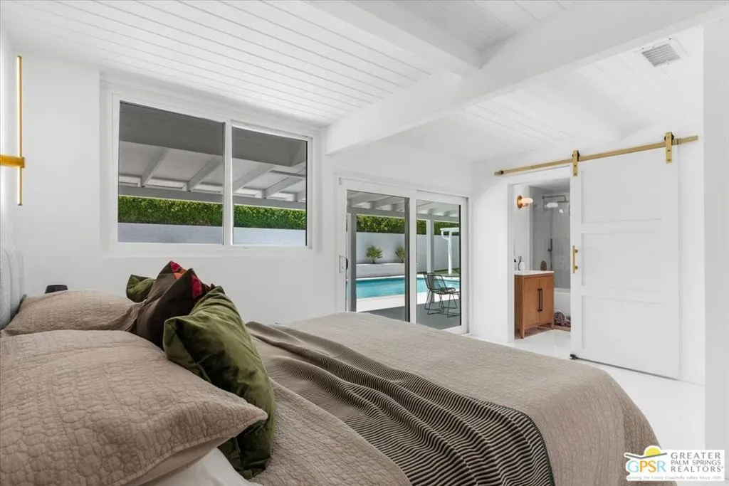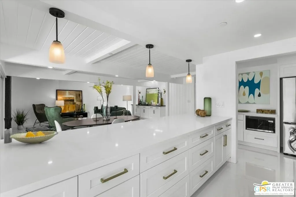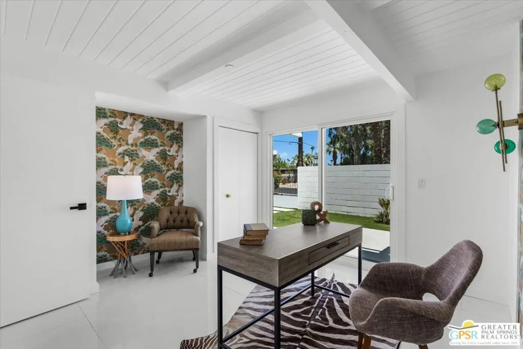 Located in the highly desirable neighborhood of Little Beverly Hills in South Palm Springs, this beautiful mid-century, Alexander-built home blends classic desert architecture with sophisticated modern updates. Completely redesigned, this home and casita feature five stylish bedrooms, four remodeled bathrooms, and contemporary tile flooring throughout the home and casita. The main house hosts four of the bedrooms, three bathrooms, an open concept kitchen with stainless steel appliances, and a living/dining area compete with a beautifully tiled fireplace. Blending the inside and outside living areas, a large glass sliding door and windows offer views from the living room and kitchen to the resort-style backyard complete with sparkling pool, built-in grill, and views of the San Jacinto Mountains. Accessed off the pool area or via a walkway on the north side of the property, the attached casita hosts the fifth bedroom, the fourth bathroom, a second open concept kitchen with stainless steel appliances, and a spacious living room with views to the pool and backyard living area. With an abundance of space and a flexible layout, this spacious home is ideal for entertaining, hosting guests, or perhaps creating a separate living area for an aging parent or relative. And Little Beverly Hills is currently under the 20% cap on short-term rental permits, so this home could possibly be used as an income generating short-term rental property. Other highlights of the property include dual pane windows throughout the home, 2 tankless hot water heaters, updated electrical, updated plumbing, updated sewer cleanouts, a gated driveway, and a whole house fire suppression system. With so many wonderful features and updates, this home is not to be missed. Schedule your private showing today!