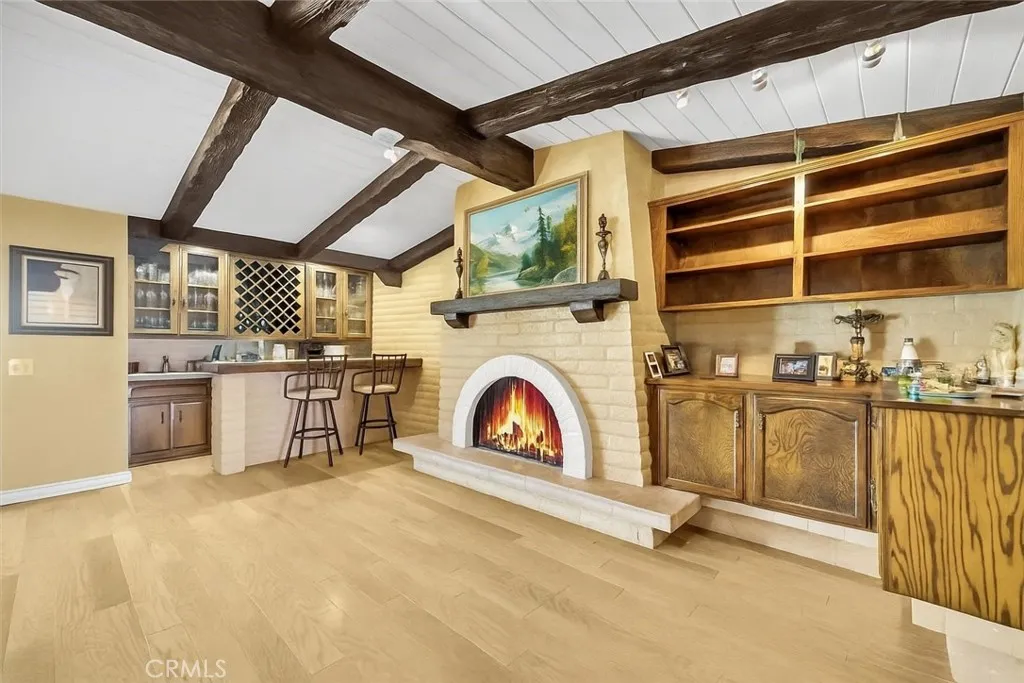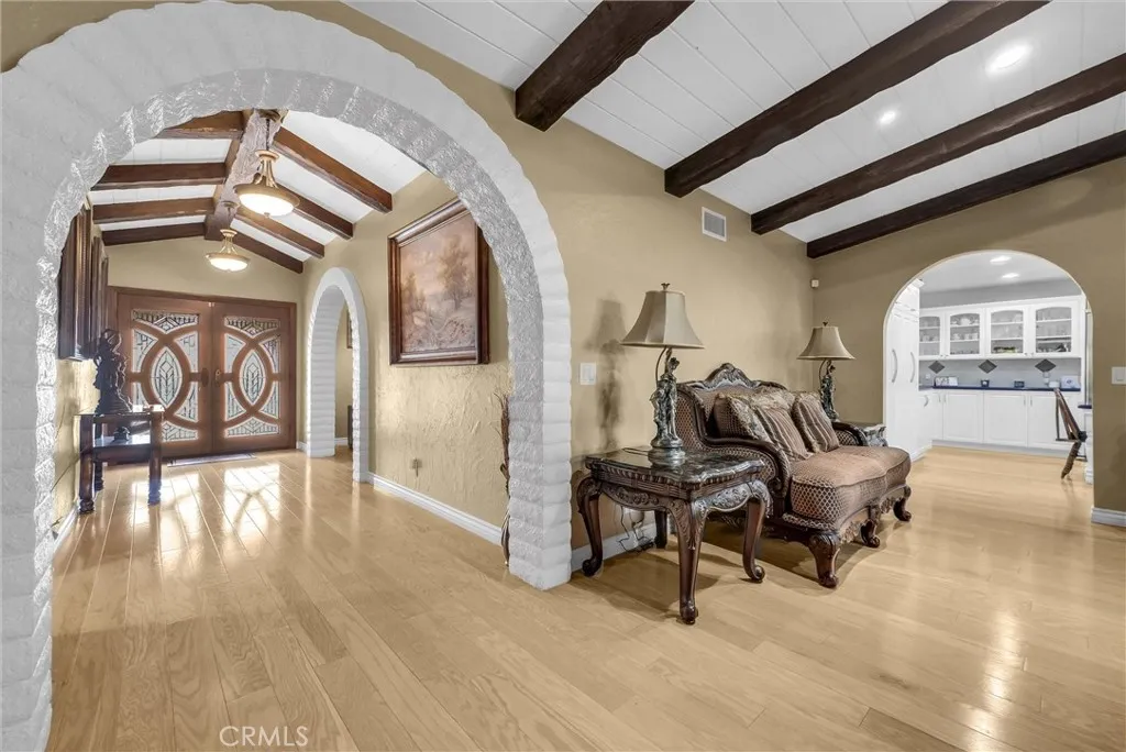 Inside the stately front doors, you’ll find hardwood floors, exposed timbers, brick archways and big windows that fill the space with natural light. The living room offers vaulted ceilings, a cozy fireplace and a custom wet bar. Around the corner, the gorgeous chef’s kitchen features quartz countertops, pro-style stainless appliances, island seating and a wall of storage.