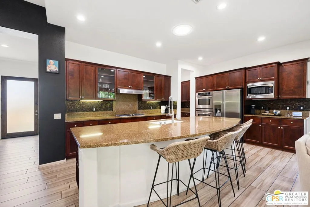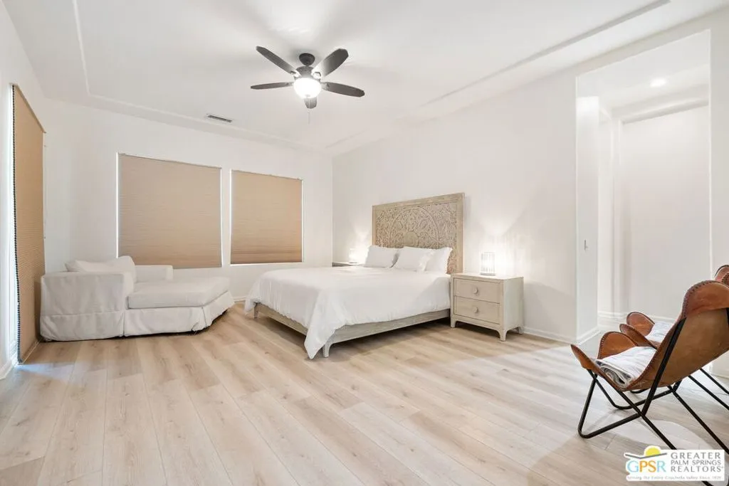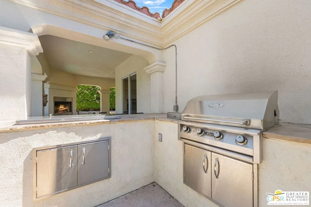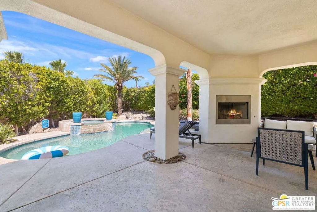 Welcome to 1420 Lorena Way a beautifully upgraded desert retreat that blends timeless elegance with modern comfort. This spacious 3-bedroom, 2.5-bath home also includes a versatile den that can easily serve as a fourth bedroom, home office, or creative studio. Designed for effortless indoor-outdoor living, the home opens to a resort-style backyard that feels like your own private paradise. Surrounded by mature privacy hedges and swaying palm trees, the outdoor space offers total seclusion and tranquility. Take in breathtaking views of the San Jacinto Mountains as you lounge by the sparkling pool, fire up the fully equipped outdoor kitchen, or rinse off in the open-air shower all while enjoying the peace and beauty of your desert oasis. Inside, an open-concept layout is filled with natural light. The living and dining areas flow seamlessly into a well-appointed kitchen with granite countertops, stainless steel appliances, and abundant cabinetry. New laminate flooring in the bedrooms adds a modern and low-maintenance touch. The luxurious primary suite features stunning views of the pool and mountains, a massive walk-in closet, and a spa-inspired bathroom with travertine counters and floors, a soaking tub, and a large separate shower. Additional highlights include leased solar with low monthly payments, FEE land (you own it!), and no HOA or restrictive community rules. Conveniently located near shopping, parks, and schools, and just a short drive to vibrant Downtown Palm Springs with its restaurants, entertainment, and cultural attractions. This home is a rare blend of privacy, comfort, and resort-style living in a prime location you’ll love to call home.
