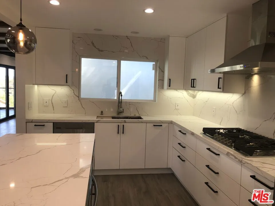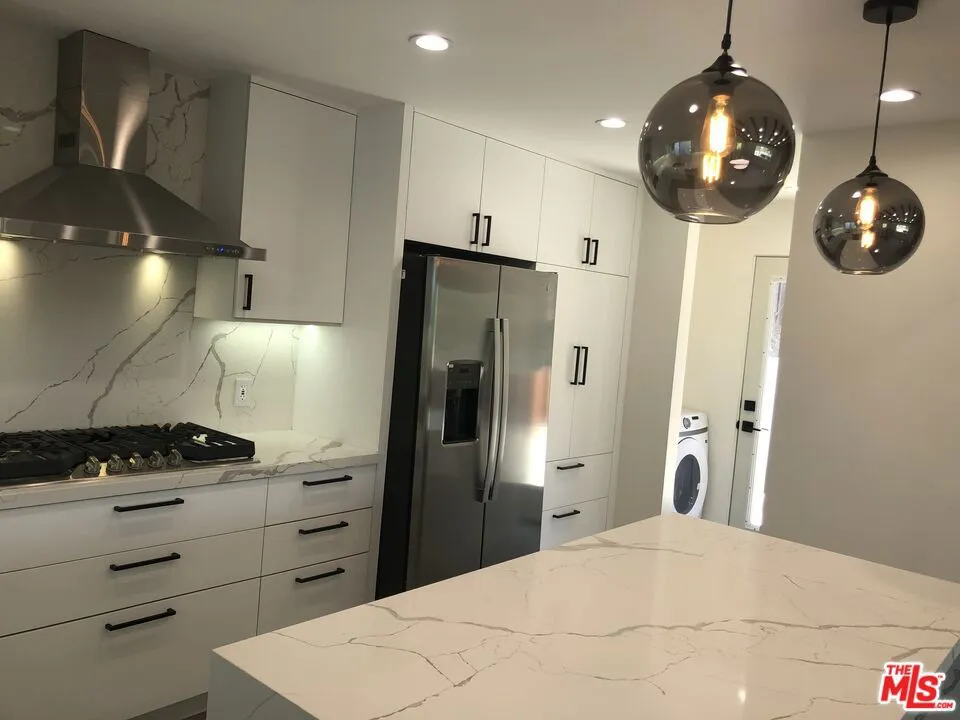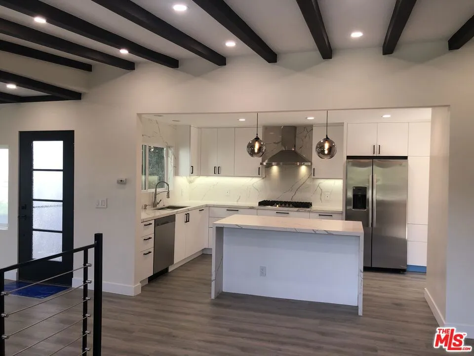 Updated, modern home, open, with a simple, clean design, offering the signature California easy living life-style inside and out, in a hillside location that offers easy access & convenience to all that L.A. offers for an active or a contemplative lifestyle. Close to the Hollywood Bowl, Universal Studios, East & West Hollywood, the Westside and beyond. At the front of the house, glass wall railings on exterior balconies that project off the main living room and the primary ensuite bedroom upstairs, with peek-a-boo views of the Hollywood Sign. Off the chef’s kitchen, a large concrete patio with views of the Hollywood Sign, the hills, the mature backyard trees, and access to a fenced in gently descending switchback style ramped walkway, that leads to a black metal security gate at the end, to the high open parking area beneath the house. An open floor plan on the main floor, spans the opaque multi-panel door entry way, with black accent ceiling beams overhead, stretching from the living room to the dining room with a gas burning decorative fireplace and the kitchen. There is a sliding door to the back brick patio and a folding glass door to the front glass railing balcony, that let in light and unobstructed views of the outdoors. Modern chef’s kitchen with white veined counter tops and matching kitchen island, stainless steel appliances. Off the kitchen is a guest powder room, with backlit mirror and across from it, is the space and hook-ups for a stacking laundry area that already has a washing machine. Exiting to outside patios from the kitchen, is a full length windowed door that leads onto the expansive concrete patio, perfect for entertaining, sunning, lounging, that has views of the Hollywood Sign and a large space for easy entertaining, a space for a bbq, built-in seating area, and a brick patio by the living room sliding glass door under a mature shade tree. Upstairs, the primary bedroom has a full length outdoor balcony, dual glass doors opening onto views. The ensuite bathroom, has a large picture window, a cool gray large tiled, glass enclosed shower, with built-in seat, a floating dual sink counter with backlit mirror, with a large walk-in closet off to the side. Downstairs, from the dining area across from the kitchen, is a large circular staircase that spirals down to the second ensuite bedroom with a view outside, that has it’s own full bathroom, with tub / shower, toilet, floating cabinet and sink with backlit mirror and a frosted glass paneled entrance door from the outside parking area. There is energy efficiency throughout, from windows to splits for AC / heat, easily controlling comfort levels all year round, a large tankless water heater and LED recessed lighting and dimmers inside and out. Two other APN’s included 2429-024-005 and 2429-024-007.