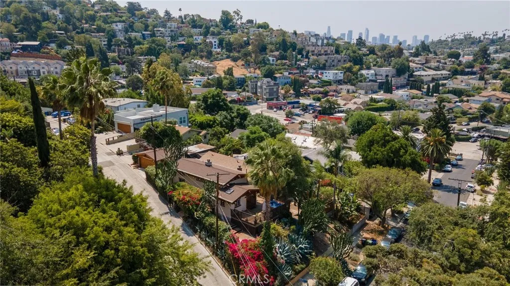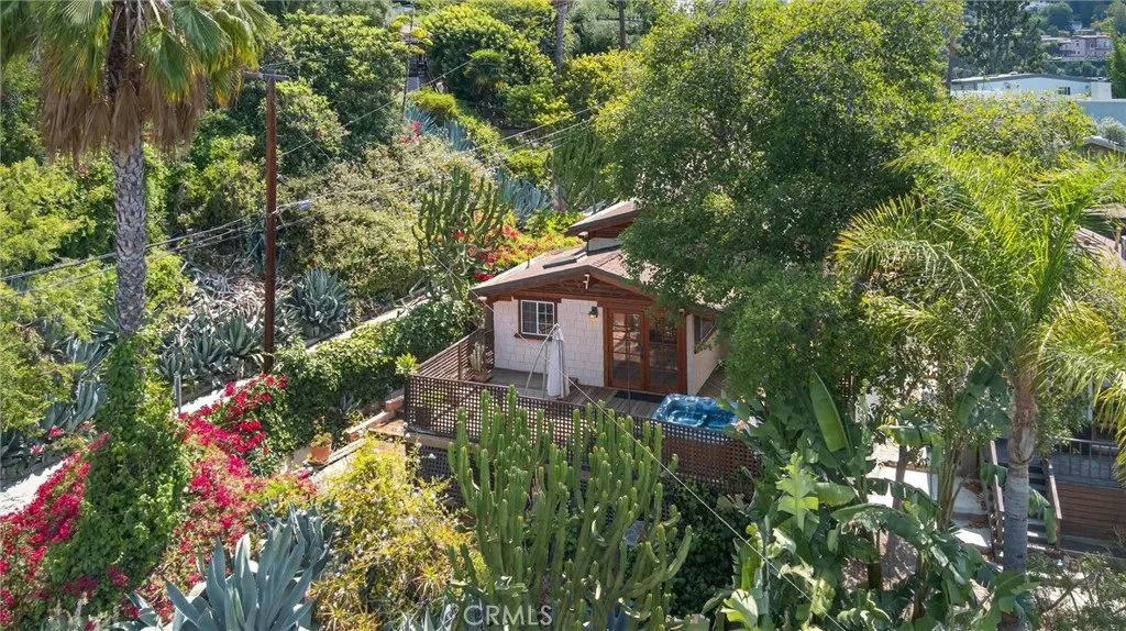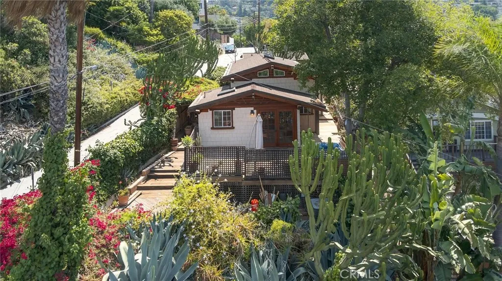 Offered for the first time in almost 50 years, this is an architectural gem located in the coveted Franklin Hills of Los Feliz. A one-of-a-kind true craftsman home, this home was designed by esteemed LA architect Kenneth Lind, inspired by the iconic Gamble House and the historic works of architects Greene and Greene. This home offers privacy, views, unmatched character and impeccable craftsmanship. Upon entering you are surrounded by decades of mature growth and varieties of beautiful succulents and towering cacti. Built with the highest quality of materials in every detail, with solid oak, douglas fir, and redwood throughout. Diagonal oak hardwood floors warm the house, while handmade solid douglas fir doors with hammered bronze knobs, tie the house together. The living room is anchored by a river rock fireplace, while stained glass art fixtures and artistic tile reliefs add rich detail throughout. Natural light floods the house throughout the day. Slate stone floors welcome you into the bathroom comprised of hand-crafted tiles, a clawfoot tub, and a multi-showerhead walk-in with brass fixtures. Some additional features for modern comfort include central heat and AC. Closets lined with pristine cedar planks, storage nooks, and Elfa shelving. A second bedroom offers a large walk-in closet with plumbing for a potential second bathroom. The exterior of this magnificent home displays impressive woodworking craftsmanship, hardy board siding, and copper gutters and downspouts. Up on the chimney sits the vigilant owl, perched to keep watch over this jewel of a home. Enjoy city and sunset views from the wrap-around wooden deck, or soak in the jacuzzi under the trees. A newly constructed retaining wall, with 4-foot diameter pylons drilled 15+ feet deep into bedrock (buyer to verify details), provides structural integrity and peace of mind. The detached two car garage reflects the same level of artisanal detail as the main residence, with custom high length wood beams, both beautiful aesthetically, and structurally sound. Walkability to restaurants, night life, grocery stores and Sunset Junction. Perched high above the street for ultimate privacy, yet minutes from Griffith Observatory, The Greek Theater, Hollywood Bowl, and countless restaurants and cultural hotspots. This is a once in a generation opportunity to own an irreplaceable piece of Los Angeles history, one which could never be replicated today.