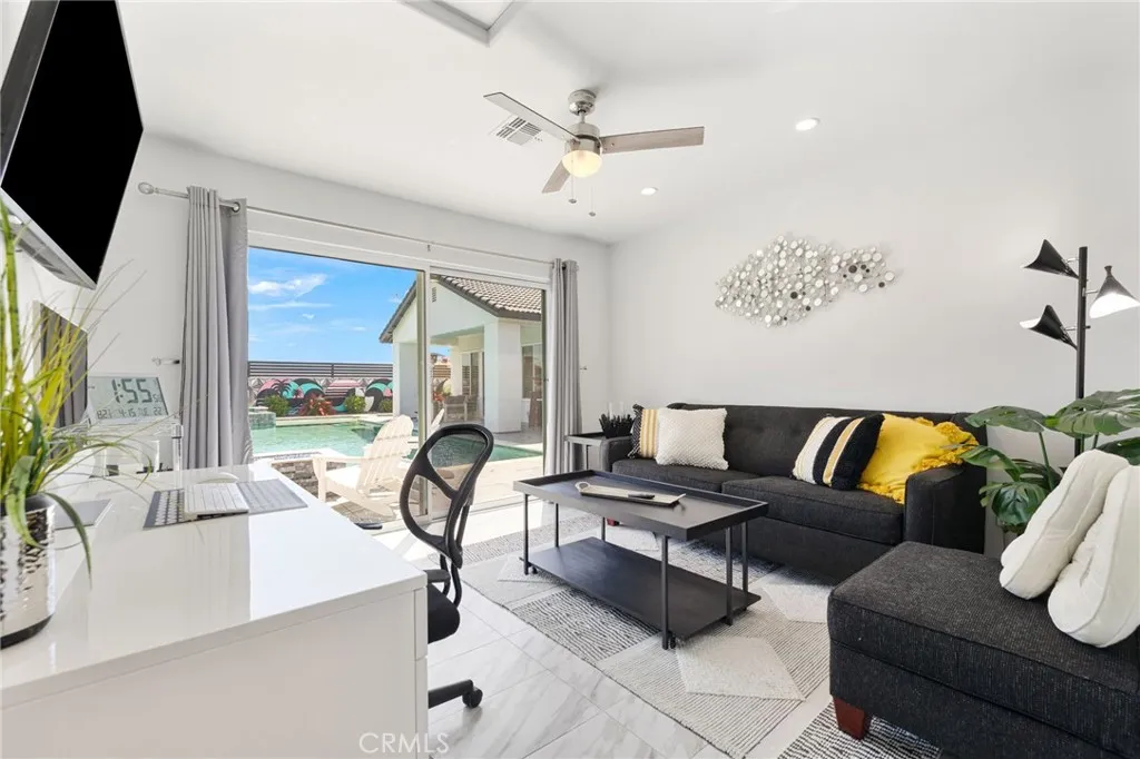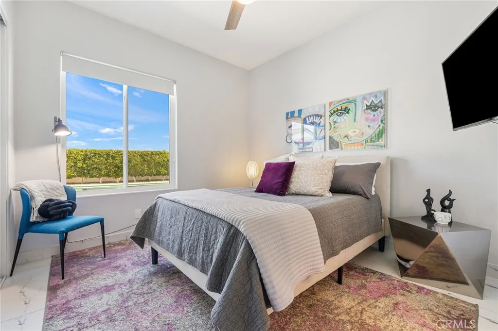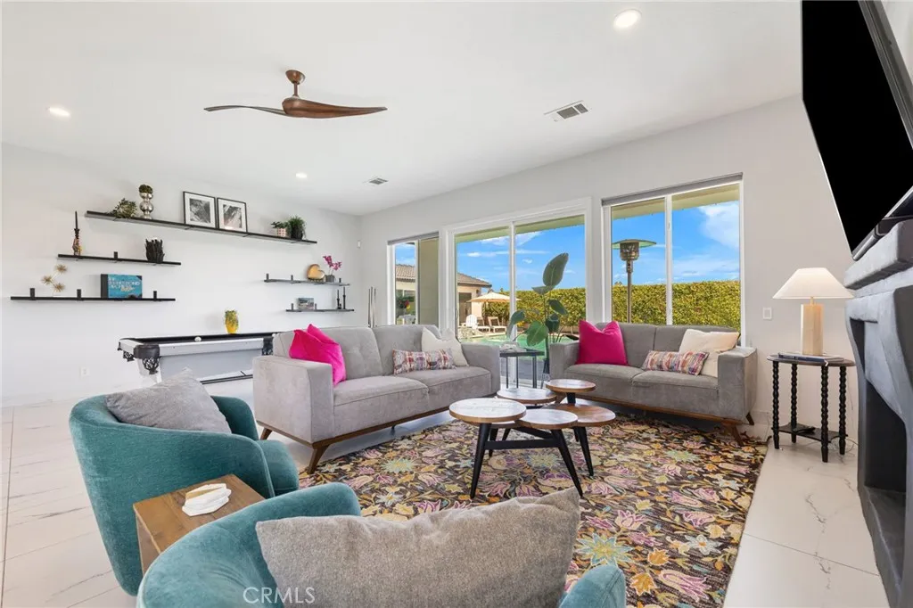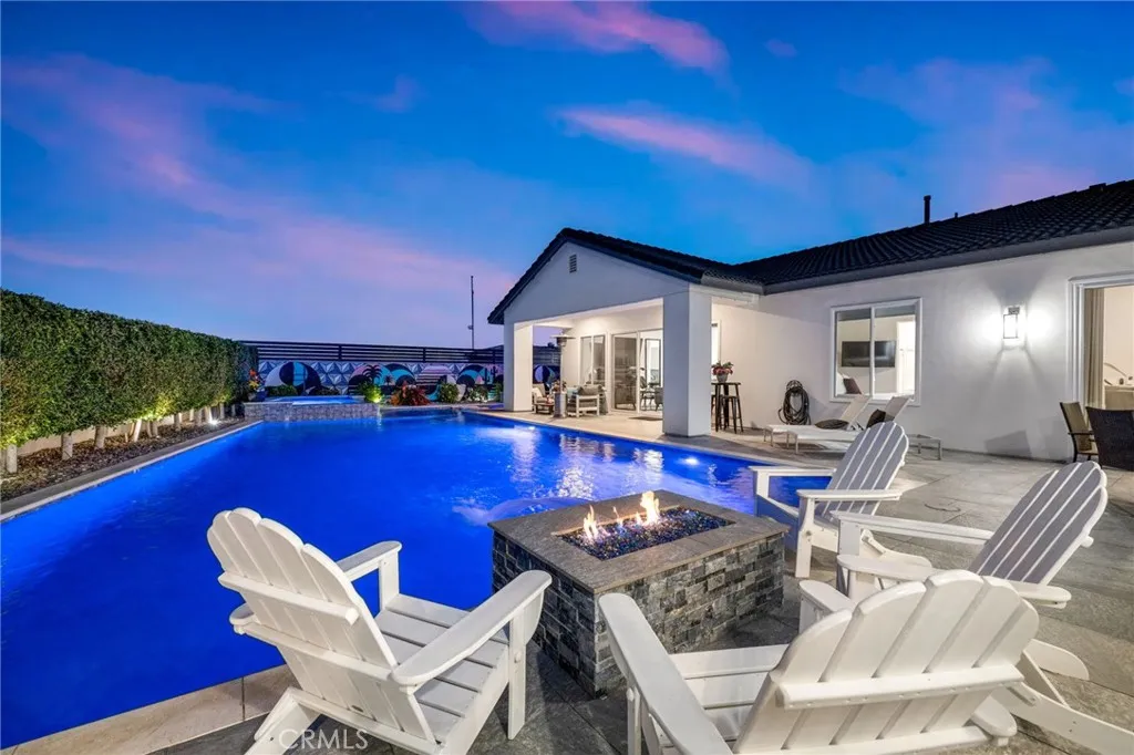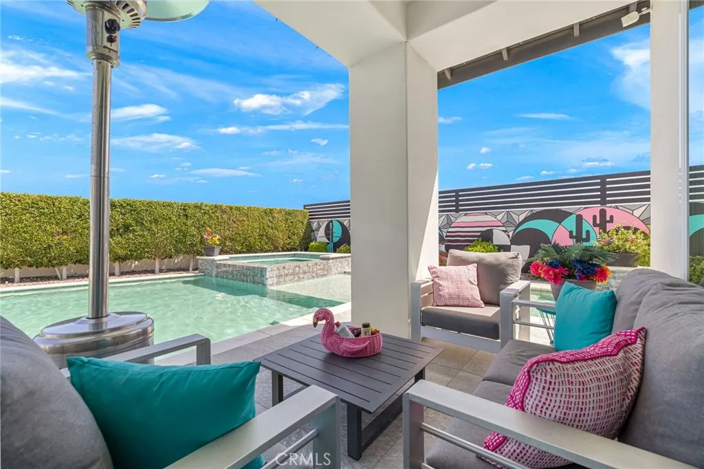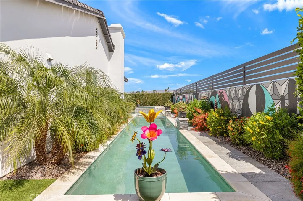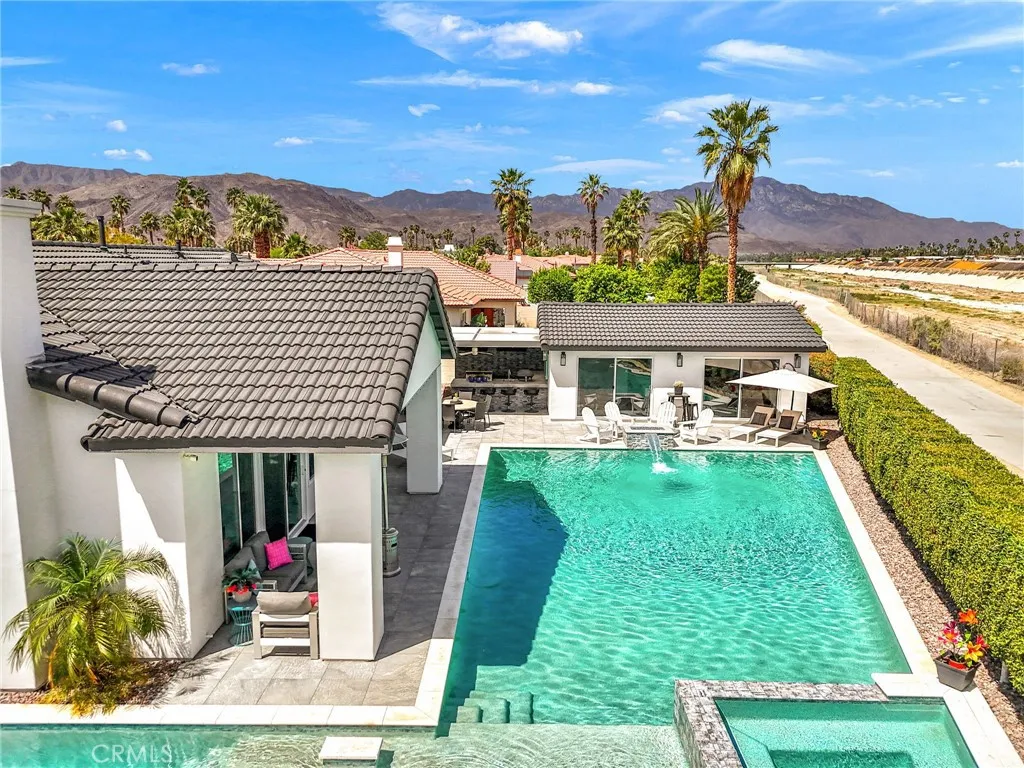 Outside, a private oasis awaits: a 52-foot lap pool, a stunning 40’x25’ smart-controlled designer pool, and a 10-person spa anchor the showstopping outdoor experience. A putting green, citrus trees, and lush hedging frame the grounds, while multiple dining and lounge areas—complete with a pizza oven, bar seating, and two LED TVs—set the tone for unforgettable gatherings. A striking 70-foot mural by celebrated artist Steven Van Art adds a one-of-a-kind Coachella-inspired backdrop.
