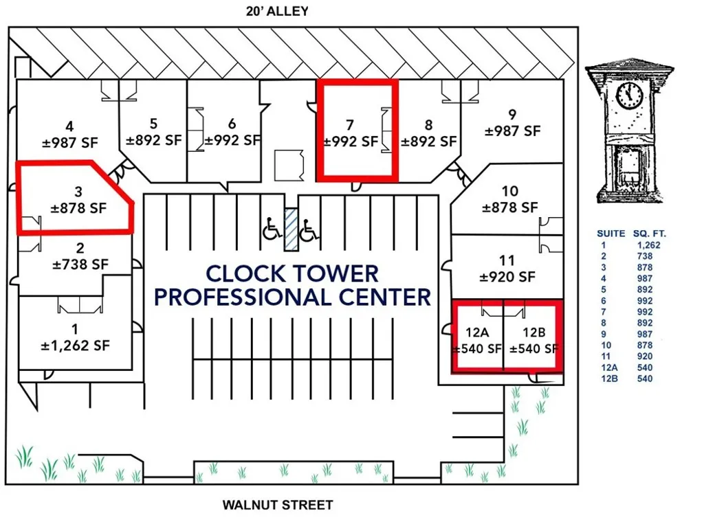 Clock Tower Professional Center is an 11,690 SF multi-tenant property with 60 shared parking spaces. Small office suites for lease within a well-cared-for property. The suite has recently been repainted and received new carpet. HVAC was replaced in 2021. The center is located at the southwest corner of Walnut St & Hesperia Rd in the City of Hesperia. This area sees significant daily vehicle traffic because this is the primary access point from southbound Hesperia Rd to eastbound Main St and the bridge over BNSF railroad.