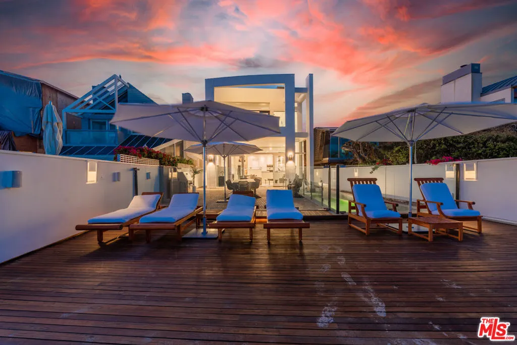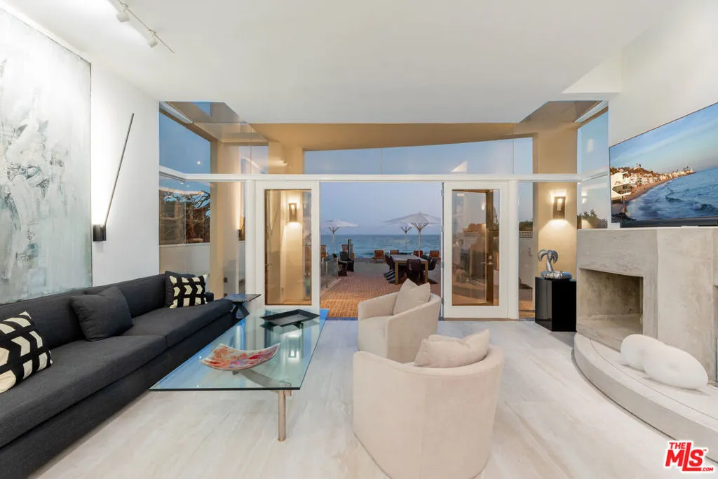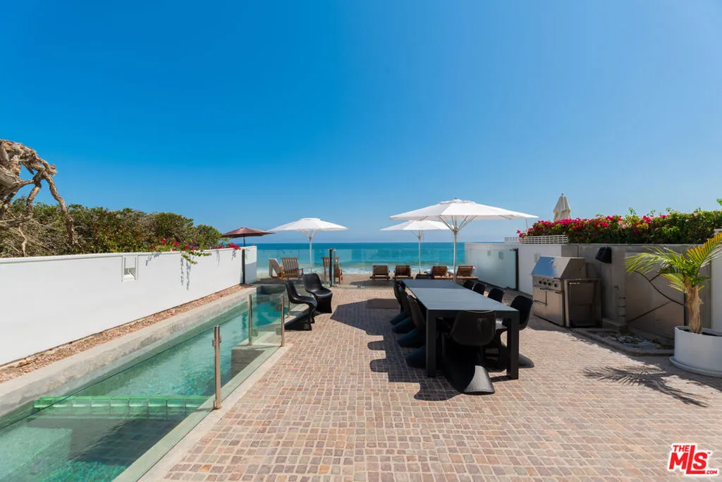 Located on the deepest part of sandy Malibu Colony beach, this stunning, recently remodeled architectural residence evokes the essence of Malibu beach sophistication. Gated for privacy, one enters into a fully landscaped courtyard where they are greeted by a modern water feature which leads to a large glass and beam enclosed entry. The impeccably furnished dining and living areas are as inviting as they are inspiring with soaring ceilings, recessed cove lighting, retractable buffets, significant art walls, contemporary fireplace and an ocean side wall of glass. Show off your culinary skills in style while watching the waves break in this newly completed entertainer’s kitchen, which showcases gorgeous stone finishes, Miele appliances and touch-open cabinetry for that extra touch of class. The comfortable den includes a chic gallery wall of photography and display shelves for your collections. A private stairway takes you past the office alcove to the ocean view master suite and bath equipped with a glass privacy partition, skylights that allow you to star gaze from the bed, as well as a sitting area and oceanfront patio. There are three additional en-suite bedrooms and a detached studio perfect for live-in staff or visiting friends. There is an internal courtyard opposite the entry for casual conversation over a fire pit. The spacious beachfront patio with pool, spa, lounging and dining areas is the dream location for entertaining friends or a peaceful retreat for relaxing. The height of luxury in the heart of Malibu’s ‘Gold Coast’ awaits!