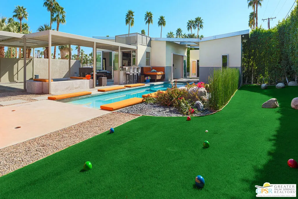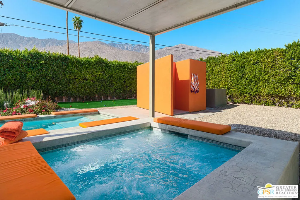 AVAILABLE March 16, 2026 to Dec 31, 2026, and starting April 1, 2027. Seasonal Rental. This unique Palm Springs modem compound is in the popular Twin Palms Estates neighborhood. The walled and gated property features multiple structures and outdoor spaces, resort-style amenities, and architectural design reminiscent of the iconic Alexander butterfly mid-century modern homes. This Palm Springs home truly speaks to the Art of Desert Living, has been cited and featured in a variety of magazines worldwide and won Home of The Year in Metropolitan Home. The art of desert living is best exemplified in a property’s outdoor amenities, and this property doesn’t disappoint. Amenities include a 60 ft saltwater pool, large saltwater spa, outdoor kitchen, outdoor bed, 4 fire-pits, 2 outdoor showers and more. There is about 2,000 sqft of interior space spread out over 3 buildings. The main house consists of a living room, dining room and kitchen. All rooms have concrete floors and large sliding glass doors, that when opened, blur the line between indoor and outdoor spaces. The living room features a wall mounted TV plus a large seating area with L-shaped sofa, ottoman and 2 comfortable chairs. A large sliding glass door connects the living room to an outdoor bed with pool and mountain view. Next to the Dining room is the kitchen. The two rooms are separated by a breakfast bar with a built-in fireplace. The kitchen itself has a modem and commercial vibe and features high quality appliances including large stove top with grill, oven, wine refrigerator, refrigerator freezer and dishwasher. The adjacent dining room seats six and has two over-sized sliding glass doors. One of the doors opens to a wood bridge that spans the pool to secondary ensuite bedroom and the other door opens to an outdoor dining room, distinctive firepit seating area and a detached structure solely for the primary bedroom and bathroom. The Primary Bedroom is a stand-alone structure just steps away from the main house. Like the main house it has concrete floors and a large sliding glass door, that when opened, blur the line between your bedroom and the outside. Inside you’ll find a King size bed, spacious closet, Smart TV and gas fireplace that separate the bedroom from the master bathroom. On the bathroom side, the fireplace is perfectly situated next to the large bathtub. Who needs candles when you can soak beside the flames of a roaring fireplace? There is also a large shower with waterfall shower head, two large sinks, a clerestory window and a door that opens to a private outdoor shower. The Guest bedroom/den structure features a guest bedroom with queen size bed and Smart TV. A bathroom connects it to the guest living room that features a couch that can sleep one, and another Smart TV. The main purpose of this Palm Springs modern compound is “rest, rejuvenation, and fun”. Flanking the 60 ft saltwater pool, lounge chairs and large outdoor bed float above the water while the outdoor kitchen with gas grill, refrigerator and bar seating area anchor to the additional yard amenities. Next to the outdoor kitchen is a bubbling saltwater spa which is just steps away from an additional outdoor bed perfect for lounging. At the other end of the pool is the Pool House that provides an outdoor shower, cabana room and washer/dryer. On the other side of the compound is a distinctive seating area where guests can sit or lie on huge boulders encircling a recessed fire pit that shoots flames right out of the ground. This desert modern home is distinctive and award-winning; providing an elemental experience that includes earth, fire and water with a generous serving of Palm Springs architecture, upscale amenities and conveniences, and a chic urban vibe.