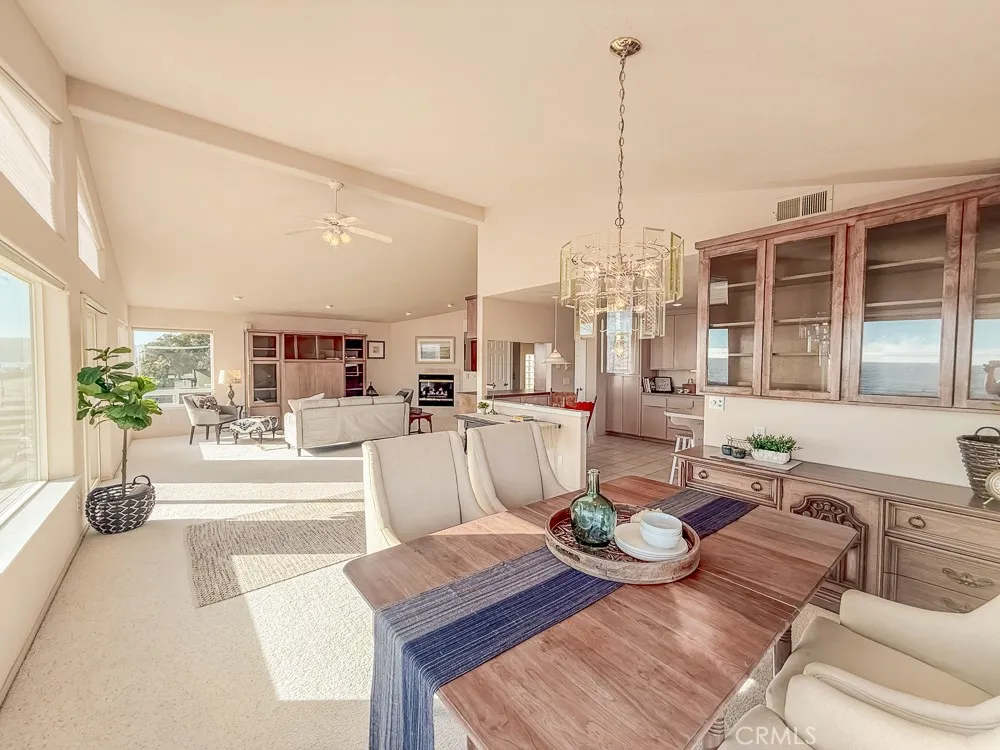 The expansive main living area on the top floor features vaulted ceilings and wall-to-wall windows that showcase the stunning ocean views of Estero Bay from Morro Rock to the Cayucos Pier and beyond. The kitchen has lots of counter space and storage, a cute breakfast nook, and large island with an adjacent dining room overlooking the ocean or mosey outside to the wide upper deck to relax during the gorgeous sunsets. Throughout the comfortable open living area you’ll find beautiful custom built-ins plus a cozy fireplace. Off the living room is the large primary bedroom ensuite with soaker tub, shower, double vanity, extra large walk-in closet, second closet, and laundry room.