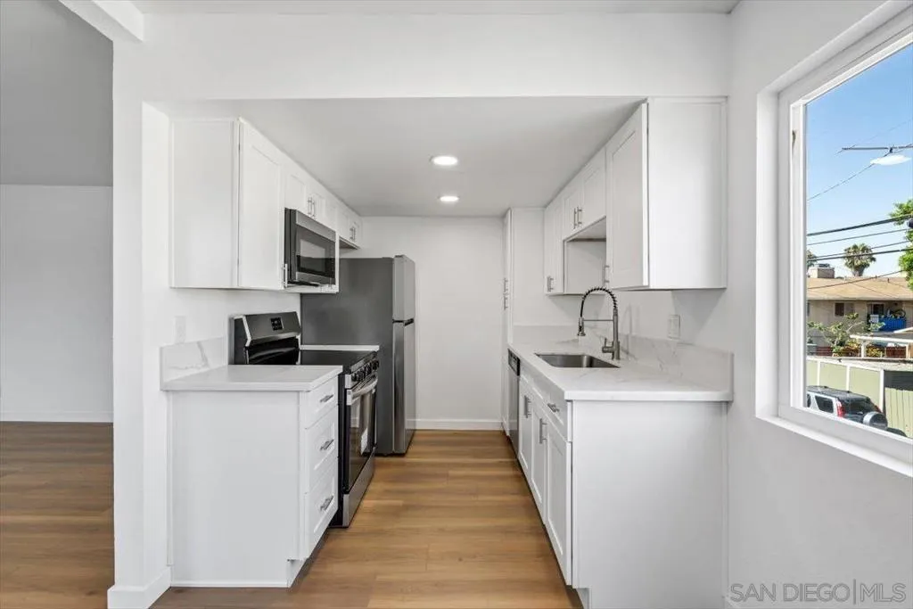 Price Improvement!!! Step into modern elegance with this beautifully renovated 2-bedroom, 1-bath, 748 sq ft condominium, where every detail has been thoughtfully designed for style, comfort, and function. Throughout the home, premium laminated flooring offers a seamless, contemporary look, complemented by new designer light fixtures and abundant natural light through brand-new windows. The kitchen is a true centerpiece, featuring sleek new cabinetry, high-quality stainless steel appliances, a new garbage disposal, and modern water fixtures—perfectly blending beauty and practicality. Both bathrooms have been tastefully updated with stylish new vanities, modern toilets, reglazed bathtubs, and upgraded fixtures for a fresh, spa-like feel. Additional enhancements include custom closet doors, new interior doors, new electric wall heaters, and upgraded power outlets—all brought together with fresh, designer-inspired paint for a refined, move-in-ready presentation. Situated in a well-maintained community, this residence offers a convenient location with easy access to shopping, dining, parks, and major freeways—just minutes from Downtown San Diego, Mission Valley, and the city’s scenic beaches. Whether you’re seeking a stylish primary residence or a beautifully updated investment property, this home offers the perfect blend of comfort, quality, and convenience.
