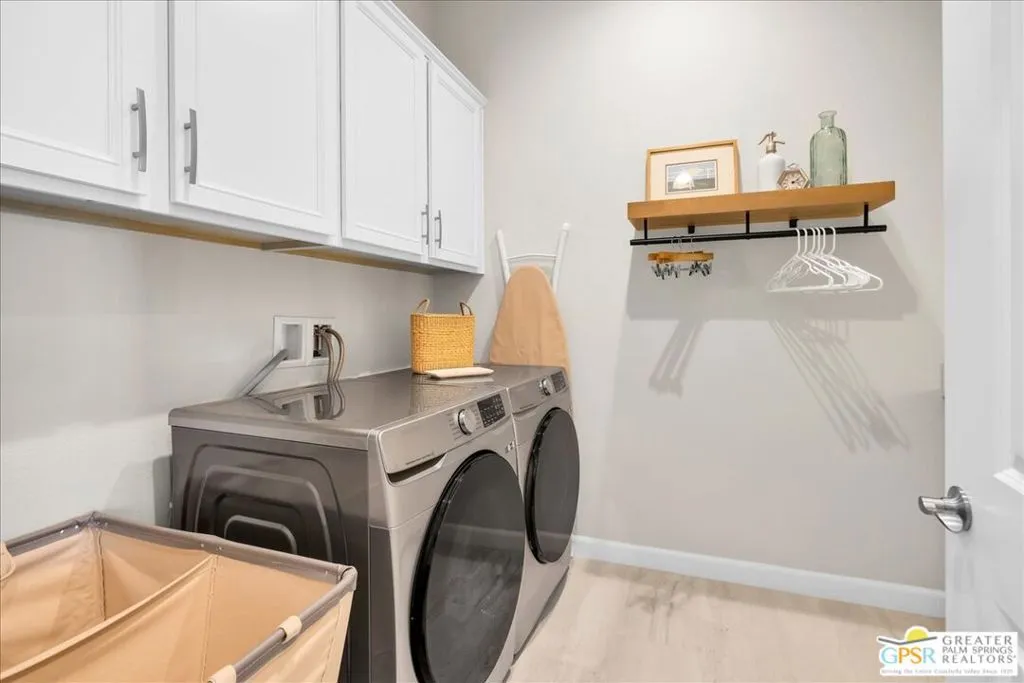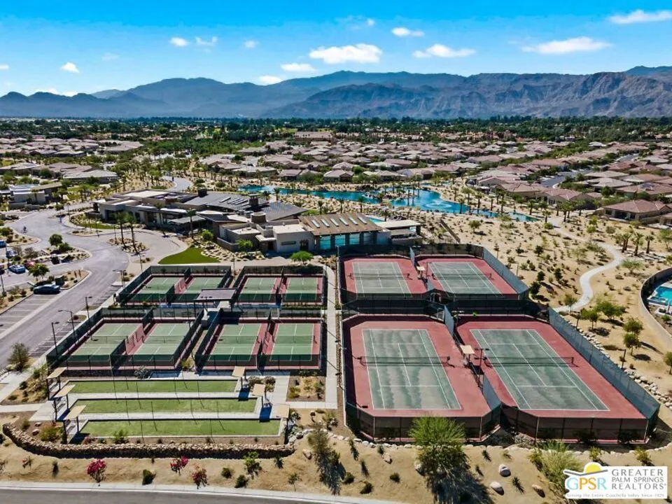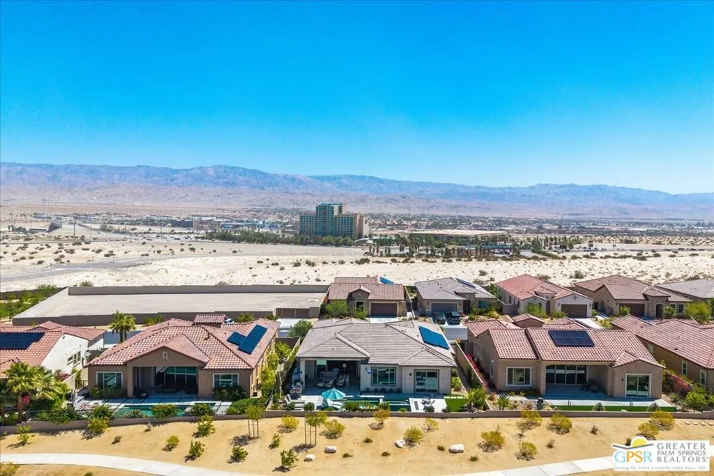 Welcome to Del Webb, where luxury meets effortless desert living. This exquisite Encore Series Plan 8 Serenity, nestled in the coveted Phase 6, boasts EXPANSIVE PANORAMIC MOUNTAIN VIEWS and an abundance of custom upgrades throughout. Designed with elegance and functionality in mind, this thoughtfully customized home offers two spacious bedroom suites, a versatile den/media/guest space with a powder room, and seamless indoor-outdoor living. From the moment you step through the upgraded courtyard entry – complete with a tranquil bubbling fountain – you’ll be immersed in style. Designer-selected finishes elevate every space, including statement wallpaper, 12″x24″ tile flooring, and custom window treatments that frame the stunning desert light. The chef-inspired kitchen is the heart of the home, featuring upgraded cabinetry, a striking custom range hood, quartz countertops with full backsplash, and an executive island offering generous storage and seating. Adjacent to the kitchen, a custom-built beverage center provides dedicated wine and glassware storage – perfect for entertaining. Open to the kitchen, the great room showcases soaring tray ceilings, designer lighting, and an impressive quad-panel glass sliding door system that invites you to enjoy the quintessential indoor-outdoor lifestyle. Step outside to your private desert retreat, where a custom saltwater PebbleTec pool and spa await – complete with a tanning shelf and waterfall feature. The backyard oasis also features a built-in fireplace and entertainment center, a gas BBQ with refrigerator, and bar seating – ideal for alfresco gatherings. The primary suite is a private sanctuary, with upgraded ceiling details, direct outdoor access, and breathtaking views of the mountains, nearby park, and your own firepit and pool. The spa-like primary bath includes dual quartz vanities, brushed nickel finishes, and an expansive glass-enclosed rain shower with dual shower heads and a built-in bench. On the opposite side of the home, your guests will enjoy a full ensuite bedroom with dual sinks, modern finishes, and ample privacy. The den, with glass-inset French doors, offers flexible use as an office, media room, or additional guest room. Additional highlights include, OWNED SOLAR, a spacious laundry room with upgraded cabinetry and a utility sink, a hand-selected chandelier and custom wood beam ceiling in the dining area, a rain gutter system, and a climate-controlled 2.5-car garage. Located in the prestigious 55+ community of Del Webb Rancho Mirage, residents enjoy access to world-class amenities, including a stunning clubhouse, resort-style pool and spa, state-of-the-art fitness center, bar, tennis, pickleball, and much more. This is more than a homeit’s a lifestyle. Welcome to luxury desert living at its finest.