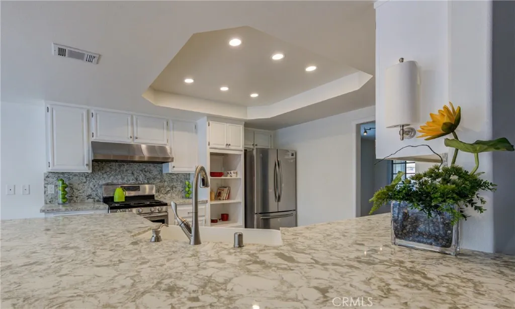 Beautiful remodeled modern townhome Plan 7 popular floor plan. Totally remodeled in the last 3 years. Newer kitchen, baths and custom Vinal wood floors throughout. Quartz countertops and stainless steel appliances. Kitchen Breakfast Nook overlooks large Patio with lush landscaping. All bedrooms are up. Main level features a large living area. Nice size family room with fireplace and access to the large Patio. Windows in this “end unit” brings lots of light. This complex has a large heated pool and 5 inground Spas conveniently throughout. Walk to the newly renovated Mall with fine Restaurants, Banks and shopping. Easy access to a private Tennis Country Club and public Golf Course. Entry gate with a Guard provides privacy.
