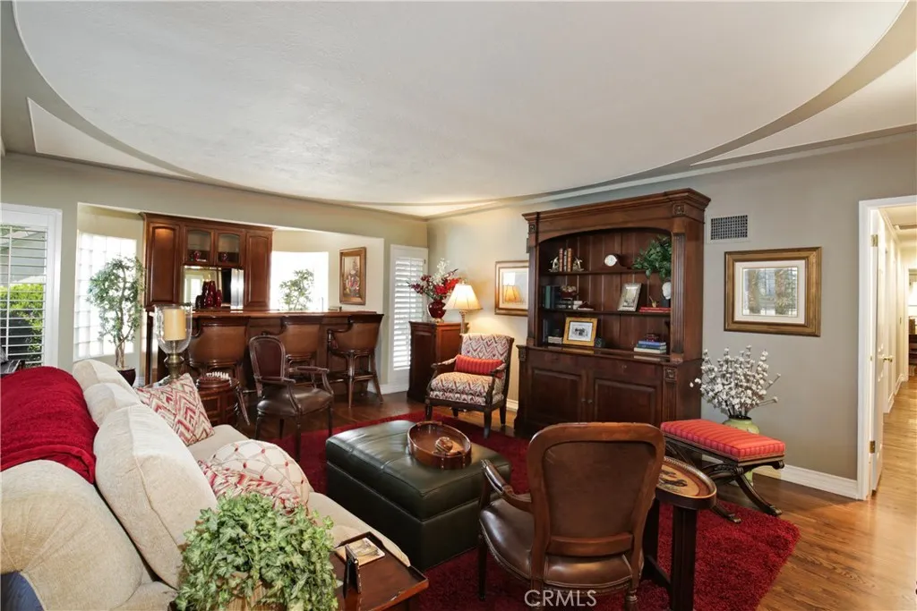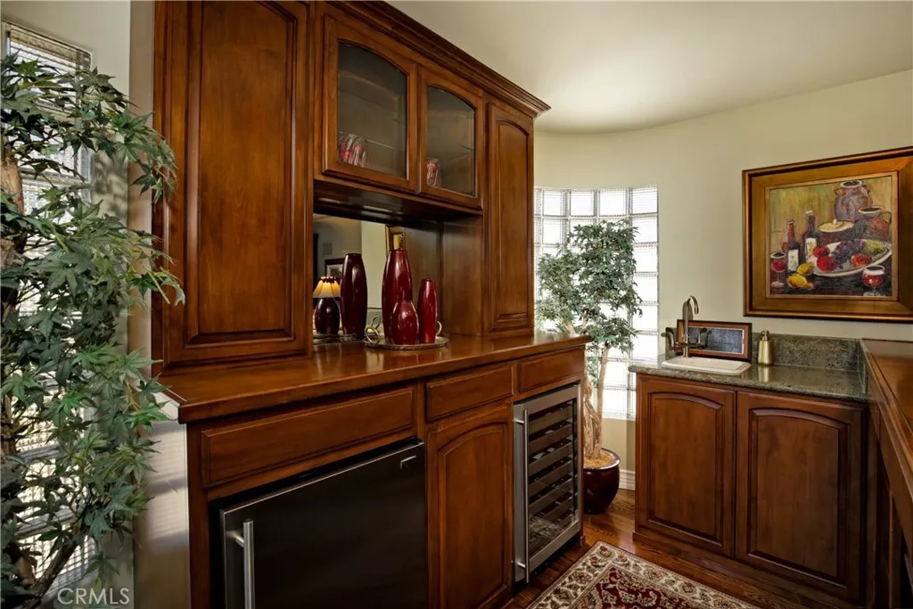 Meticulously maintained and manicured custom home in desirable Orange Estates including a beautiful 1 bedroom unit over 4 car garage. This lovely corner home is move in ready! Large formal entry opens to spacious living room with custom wet bar area. Wood shutters adorn the bay window, the ceiling has a unique design, combined with a glass brick wall and wood flooring. Formal dining room has a built-in wet bar with wine area, bow window. Gourmet kitchen has built in refrigerator, microwave, and double ovens and granite counters and beautiful tile floors. Cozy family room has gas burning fireplace. Remodeled baths and spacious bedroom. One bedroom is currently used as an office with built in desk and cabinets. This home has tons of custom cabinetry and closets for optimal storage. Beautiful covered breezeway leads to outside laundry and garage. Above the 4 car garage is a spacious 1 bedroom unit with living room and kitchen which is approximately 600 sq. ft. It has central air and heat.. Adjacent to the unit is a large storage area ( approximately 200 sq.ft.). This space can be utilized as a 2nd bedroom for the upstairs unit!