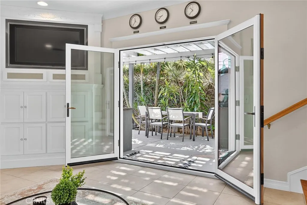 LOEWEN STEEL DOUBLE DOORS OPEN TO THE FULLY EQUIPPED OUTDOOR KITCHEN INCLUDING BAR