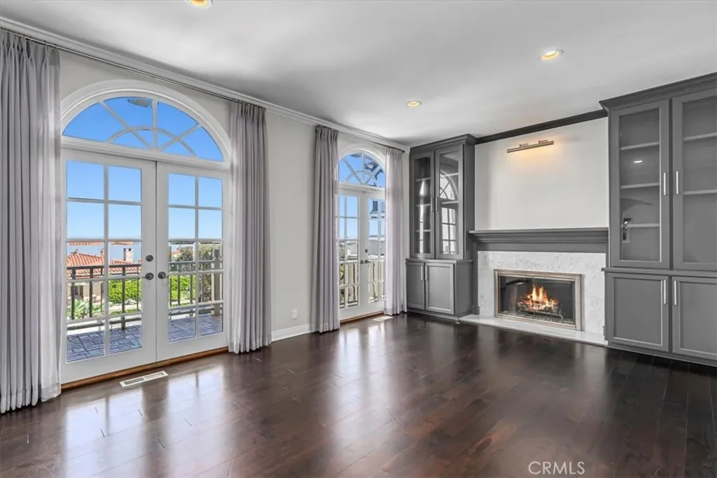 The curb appeal is striking: smooth white stucco, a traditional clay tile roof, arched doorways, and a stately paver driveway anchored by a decorative fountain. A gated entry leads to the main level, where ocean views greet you from nearly every room. The formal living room, with French doors and arched transom windows, opens to the front patio and frames breathtaking views of the coastline. The dining room, adorned with a graceful chandelier, flows into the kitchen with its breakfast nook, marble backsplash, generous counters, and abundant storage. Both spaces open to an expansive brick terrace, perfect for entertaining against a backdrop of ocean vistas and Fourth of July fireworks.