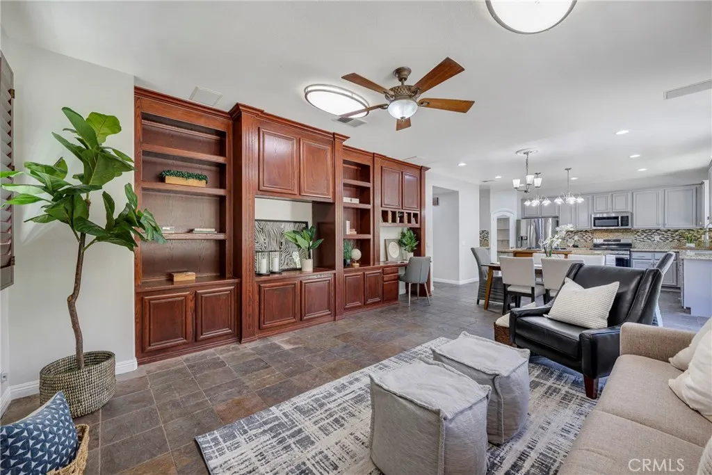 The updated kitchen with a spacious island, walk-in pantry, and stainless steel appliances opens seamlessly to the family room, where a cozy fireplace and custom built-ins create the perfect gathering space.