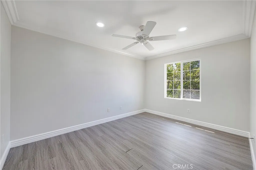 Upstairs, the primary suite offers a retreat of its own, with crown molding, inset ceiling, ceiling fan, LED recessed lighting, and ensuite bathroom complete with dual vanities, a soaking tub, and a separate walk-in shower. Down the hall are two additional bedrooms, a hall bathroom with dual sinks and a separate commode/shower room, and a convenient upstairs laundry room complete with cabinetry and a wash basin, making daily routines a breeze.