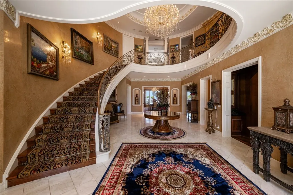 Located within the prestigious guard-gated community of Harbor Ridge and crafted by world-renowned builder Tony Valentine, 5 Ridgeline evokes the elegance of a grand European estate. Showcasing panoramic views of the Pacific Ocean, Catalina Island, Rancho Palos Verdes, and twinkling city lights, this residence offers an unmatched blend of timeless sophistication and modern luxury. Upon entering, you’re welcomed by soaring two-story ceilings and a sweeping staircase leading to the expansive primary suite and four generously sized en-suite bedrooms. Designed for grand-scale entertaining, the home features multiple formal and informal living areas, a gentleman’s office, game room, a fully equipped gym with steam shower, and a 10+ car garage. The meticulously landscaped backyard is a private retreat, offering multiple seating areas, a large pool, and a palatial koi pond. Additional highlights include solar power, two laundry rooms, and an ideal location just moments from the 73 Toll Road, world-class shopping and dining at Fashion Island, and Orange County’s most prestigious beaches.