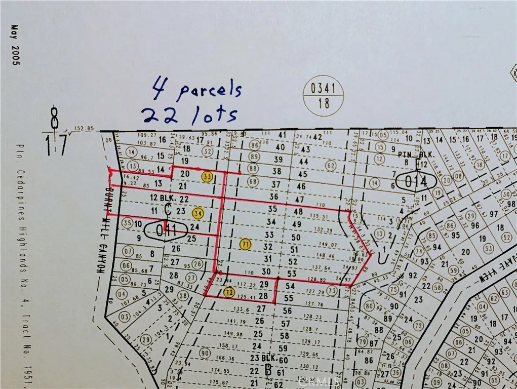 22 contiguous lots in beautiful country near Silverwood Lake. Total square footage estimated approx 63,000 square feet. Four APNs. The three lots with frontage on Burnt Mill Canyon Road are lots 11, 12, and 13. The other lots are 20, 21, 22, 23, 24, 28, 29, 30, 31, 32, 33, 34, 35, 48, 49, 50, 51, 52 and 53. The APNs are 0343-012-71, 0343-012-72, 0343-011-33 and 0343-011-34.