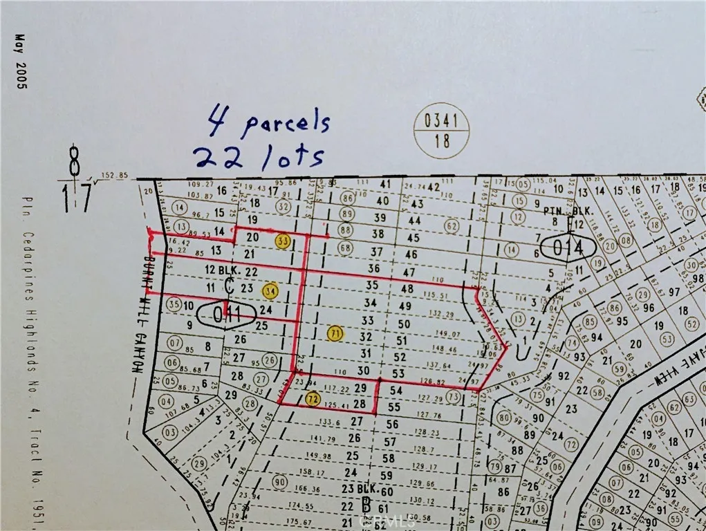 22 contiguous lots in beautiful country near Silverwood Lake. Total square footage estimated approx 63,000 square feet. Four APNs. The three lots with frontage on Burnt Mill Canyon Road are lots 11, 12, and 13. The other lots are 20, 21, 22, 23, 24, 28, 29, 30, 31, 32, 33, 34, 35, 48, 49, 50, 51, 52 and 53. The APNs are 0343-012-71, 0343-012-72, 0343-011-33 and 0343-011-34.