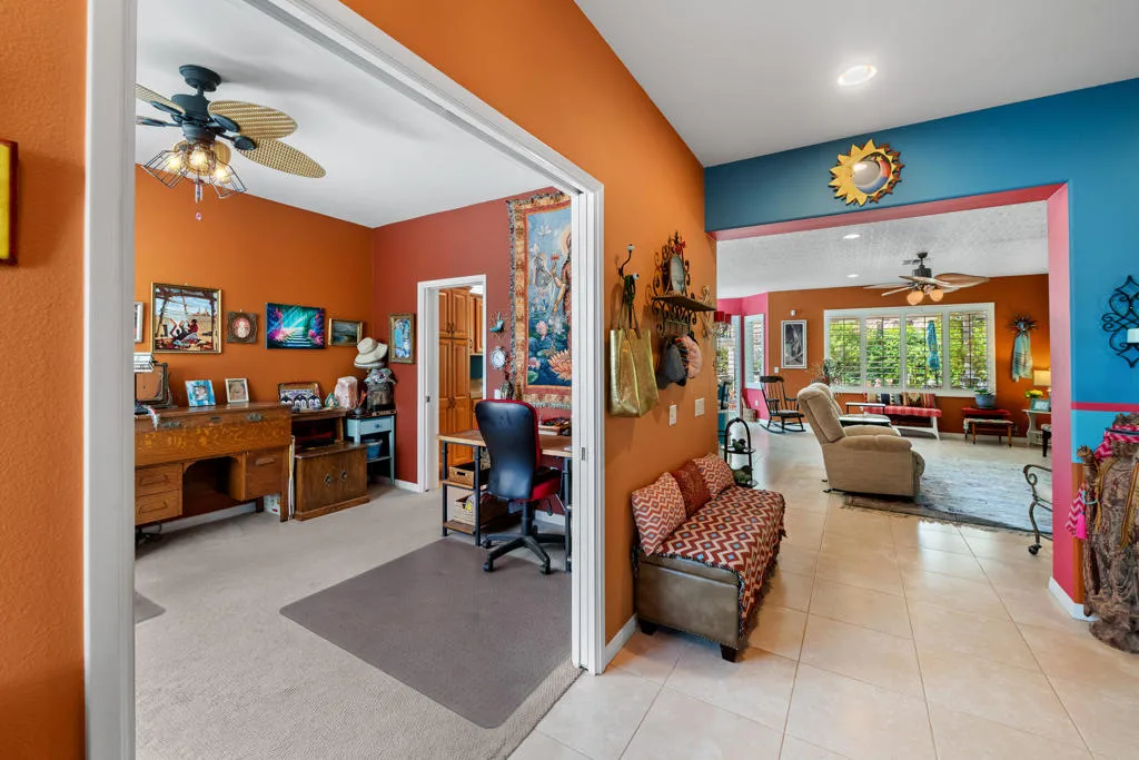 Sun City Palm Desert ”Cayman” Model 2/2+ Den with pocket doors can be an optional 3rd bedroom. Located in the new section near Lakeview Clubhouse. Custom courtyard wall with security gate gives this unique home great curb appeal! Wide hallways open to the Great Room floor plan with 9′ and 10′ ceilings. Custom wallpaper & paint, smooth finish Plantation Shutters, 16” tile floors, carpet in bedrooms, and ceiling fans are through-out. New HVAC 2024, water heater and disposal. Island Kitchen with granite tile countertops, stainless appliances and new LED canned lighting. Primary suite with a french door that opens to the rear patio, bath has a seated vanity, step-in shower and walk-in closet. Guest bedroom & bath with shower/tub combo. The South facing backyard has an extended aluma-wood covered patio, fruit trees and custom concrete hardscape in the front & back. Indoor laundry with newer front load washer/dryer and a 2 car garage.
