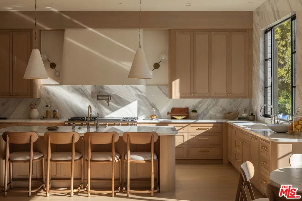 Prime Brentwood Park – Brand New Traditional by Ken Ungar. Exquisite finishes and effortless floorplan. High ceilings and gracious spaces for entertaining. Gourmet kitchen opens to vast double living room and seamlessly to the garden and pool. Wood paneled formal dining, private office, and epic bar. Primary suite with book matched marble bath and dual closets. 6 additional bedrooms each en-suite. Total of 7 bedrooms and 9 baths. Lower level features game room, bar, gym, wellness, cinema and staff accommodations. Large grassy yard with complete privacy and pool pavilion. Hard to find new construction in a most prestigious section of Brentwood Park. A rare offering.
