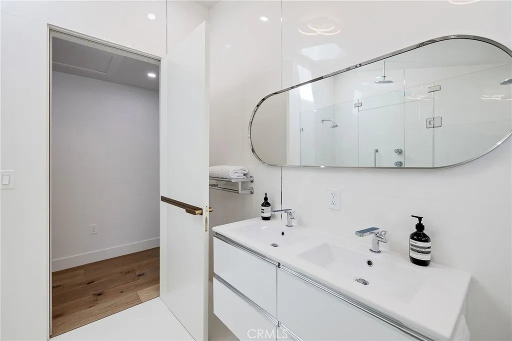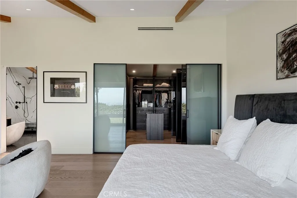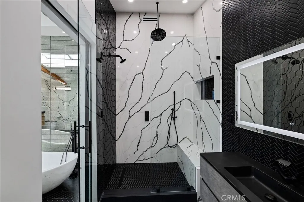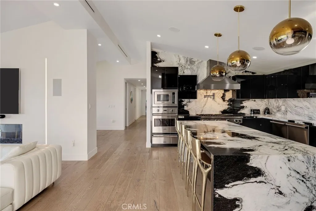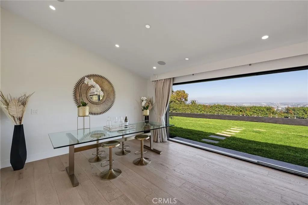 Enjoy the Long Beach skyline and LA Harbor as you enter through the oversized glass pivot door into an open floor plan designed for living and entertaining. The chef’s kitchen features black-and-white Dalmatian marble, Rohl fixtures, a large island and a suite of Viking appliances: 6-burner range, double ovens, counter-depth refrigerator and dual dishwashers. Wide-plank hardwood runs throughout; floor-to-ceiling sliders and bifold doors connect the interior with the backyard. A two-way glass fireplace anchors the great room; motorized curtains, recessed LED lighting and built-in AV are integrated.