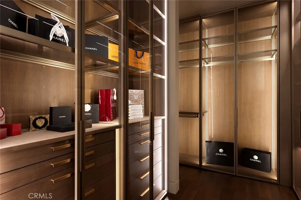 Each of the home’s bathrooms exudes luxury, with handcrafted tiles, Waterworks burnished brass fixtures, and high-end TOTO washlets. The primary suite is a true sanctuary with custom white oak beams, and a Nero Lactea marble fireplace mantle, and custom his and hers walk-in closets imported from Italy that rival most designer showrooms.