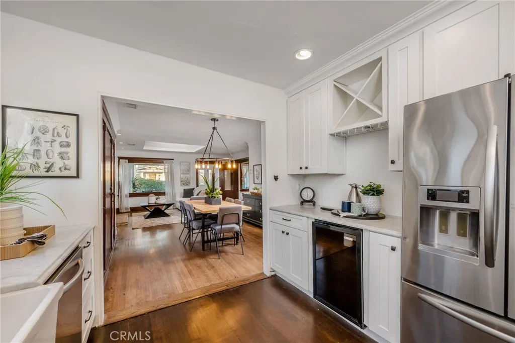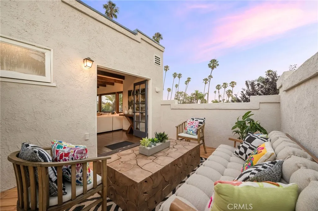 The open floor plan is bathed in natural light from a large skylight above, with the dining area flowing seamlessly into the first of two living rooms and a spacious kitchen offering generous counter space. Down the hall are two comfortable bedrooms, a conveniently placed laundry nook, and a beautifully maintained period bathroom any vintage-home enthusiast will appreciate. A single-car garage with additional laundry and storage opens to Broadway, while three more parking spaces off Ximeno ensure ample parking for residents and guests. Upstairs reveals one of the home’s most distinctive features — a striking room with beamed ceilings, a fireplace, ductless AC, and a peek-a-boo ocean view. The adjoining half bath and rooftop deck create an ideal entertaining area or a potential en suite retreat. All of this is just moments from award-winning schools, the beach, shops, and everything else that makes Belmont Heights so desirable. This is truly a unique and special home.