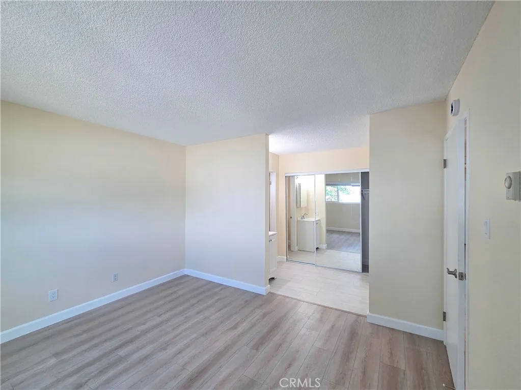 The main hallway features a large coat closet and leads to both bedrooms. The remodeled guest bathroom includes a tiled shower and a contemporary vanity sink. The primary bedroom is exceptionally large and offers dual mirrored wardrobe closets, a private en-suite bathroom, and an attached vanity area. Additional features include window blinds throughout and a ceiling fan in the dining area.