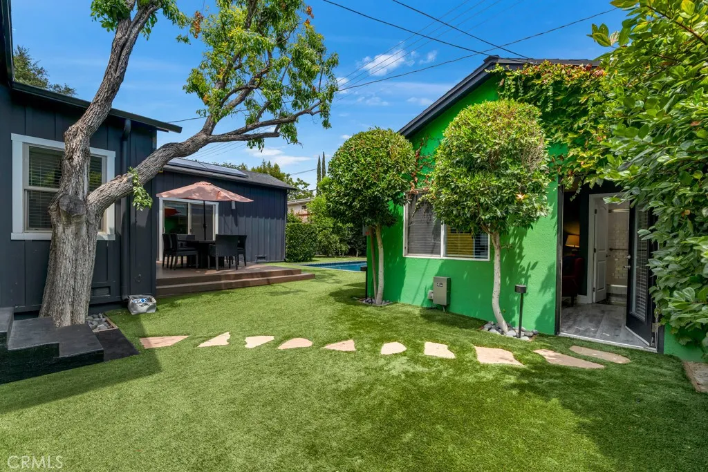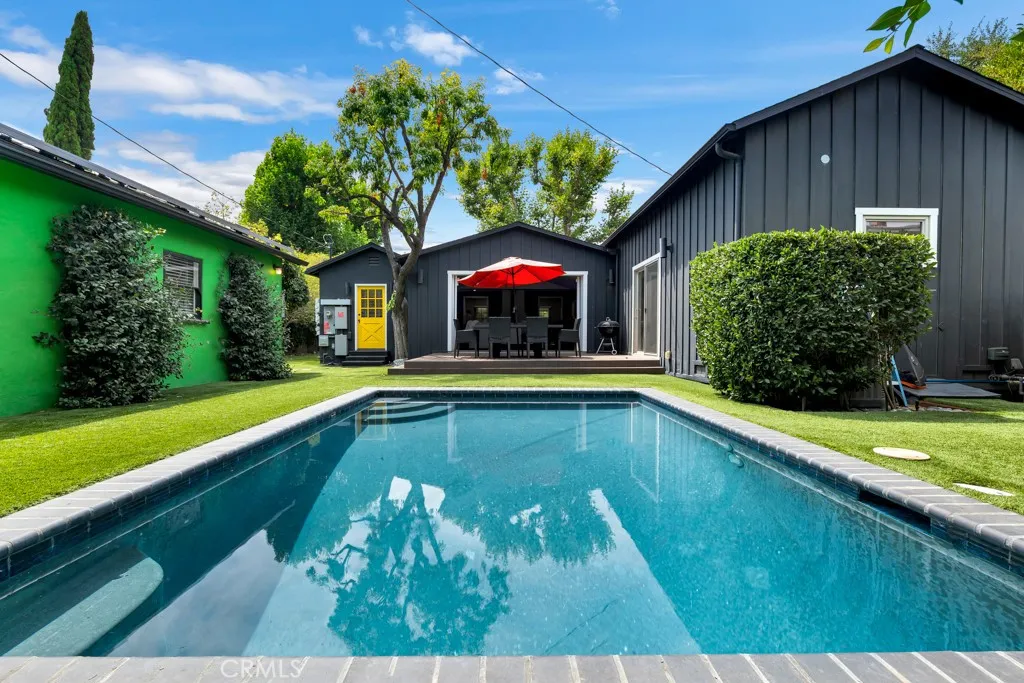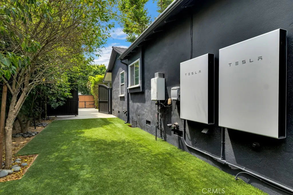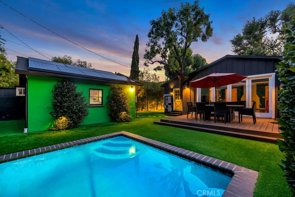 The airy great room is accentuated by large modern bi-fold doors that open up completely to reveal a brand-new deck and an exquisitely landscaped backyard. The outdoor space boasts a heated saltwater pool and a Studio ADU equipped with its own full kitchen. Additionally, the property is outfitted with fully paid-off Tesla solar panels and two Tesla batteries, enhancing its energy efficiency. This incredible opportunity is not to be missed!