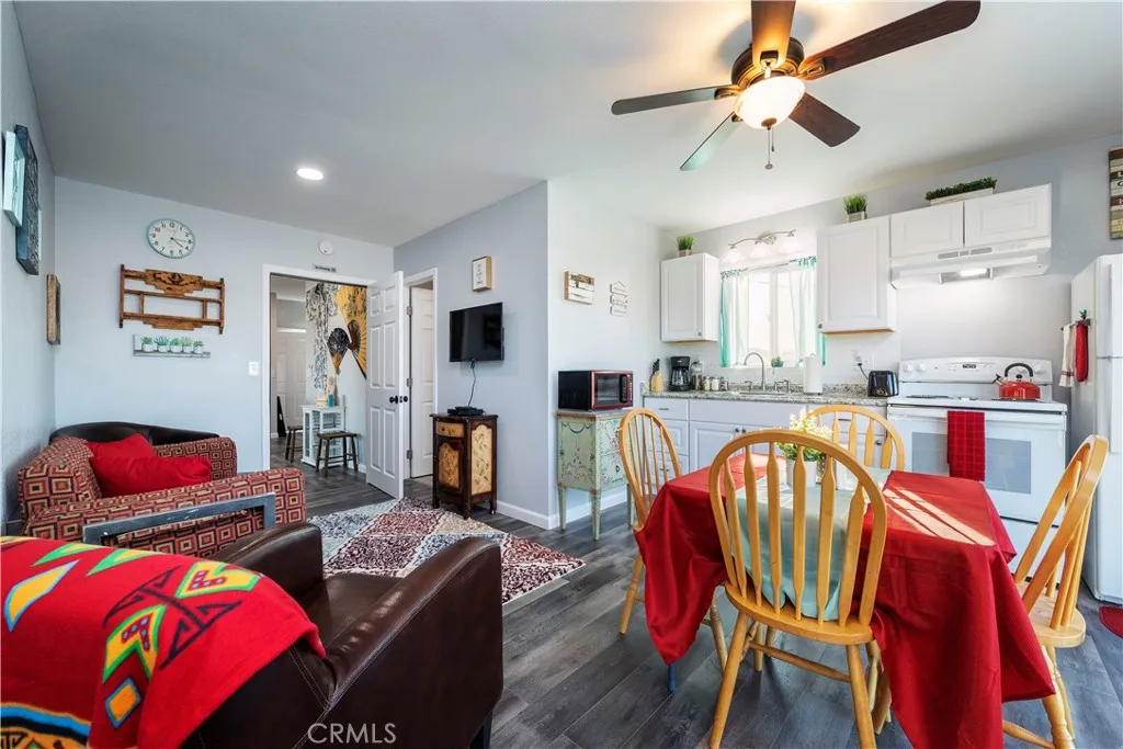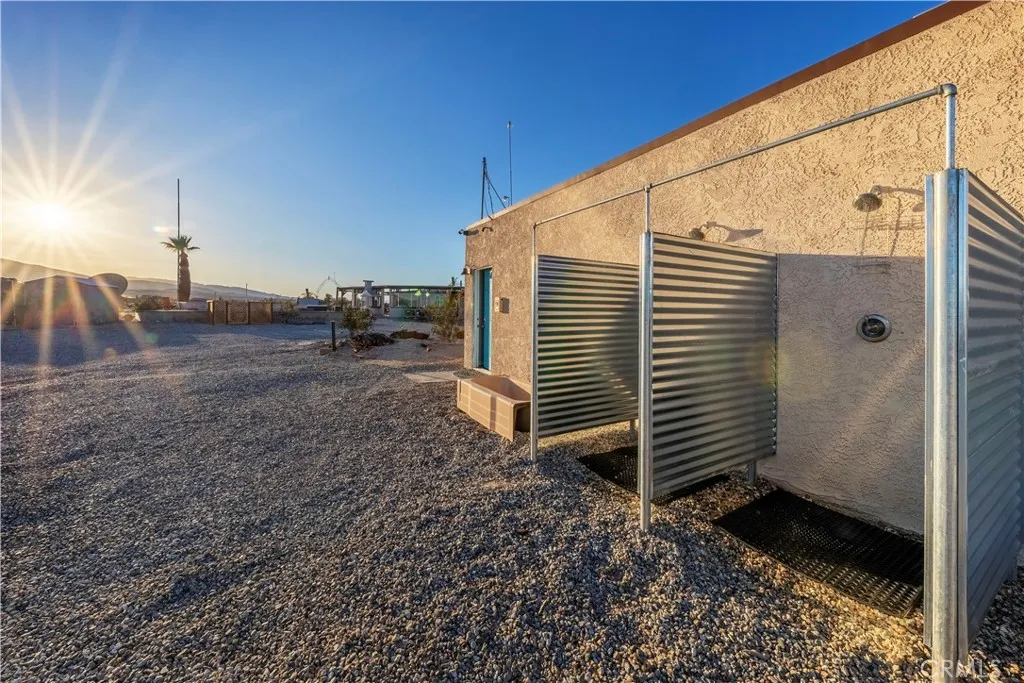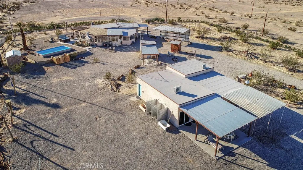 Escape to a secluded 20-acre corporate retreat compound designed for privacy and serenity. This exceptional property boasts three homes and 4 APNs, a tranquil yoga room, and two inviting pools, creating the perfect setting for both relaxation and recreation. The central building features a sunlit yoga studio with sliding glass doors that open to stunning views of the expansive desert landscape. A bright kitchen, complete with a dining table, lounge chairs, and sliding glass doors, offers an ideal space for meals or quiet moments with tea. The main house includes an open bedroom, two bathrooms with showers, a covered patio lounge, and two outdoor showers. Step outside to a shaded patio that leads to a pool and deck, where you can unwind while taking in the vast desert scenery. An exterior shaded area features a private outdoor bathroom equipped with a sink, shower, and toilet.