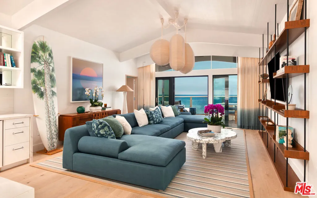Tucked behind a gated entrance, this coastal retreat exudes tranquility and elegance from the moment you arrive. A beautifully landscaped paver walkway leads through a pergola-covered courtyard where wood floors, built-in couches, a fire pit, and an outdoor dining area create an ideal alfresco setting. A hint of barbecue smoke, salt air, and the distant sound of waves set the tone for a serene lifestyle just steps from the beach.Inside, the heart of the home is a sunlit chef’s kitchen with high ceilings and warm wood flooring. A substantial stone island with bar seating anchors the space, complete with a filtered water line and sink. From here, sweeping ocean views serve as your backdrop. Outfitted with a Sub-Zero fridge and freezer, Wolf double oven, six-burner cooktop with pot filler, mini wine fridge, microwave, and Cove dishwasher, the kitchen is as functional as it is beautiful. Built-in shelving and a sleek hood fan complete the space.The kitchen flows seamlessly into the living room, where wood floors continue under soaring barrel ceilings. Ocean views pour through sliding glass doors that open onto an expansive deck, perfect for dining, lounging, and enjoying dramatic coastline panoramas. Built-in shelves frame the room, offering both elegance and utility.Adjacent to the kitchen, the primary suite offers an elegant escape, featuring wood flooring, high barrel ceilings, and French doors leading to the oceanfront deck. Wallpaper accents add a refined touch. The ensuite bath is clad in ocean-blue stone with a double vanity, built-ins, a luxurious steam shower with dual showerheads, and a private water closet. A spacious dressing room with skylight and custom built-ins provides generous storage.Two additional bedrooms are accessed via a hallway off the main living area. Each features warm wood floors and high ceilings, one with a built-in closet and barrel ceiling, the other with French doors to closet space. The shared bath at the end of the hall features nautical-inspired tile, a skylight, shower stall, and stone vanity, echoing the home’s seaside charm.With a two-car garage, integrated 2N home automation system, and an alarm system, this property combines modern convenience with timeless style. Whether entertaining on the deck, relaxing in the courtyard, or enjoying direct beach access via private steps, this home offers the rare blend of coastal living and refined designall in a coveted beachfront setting.