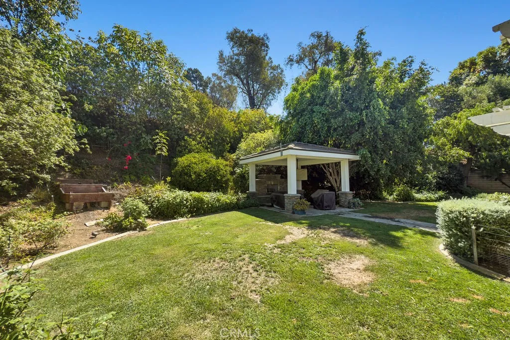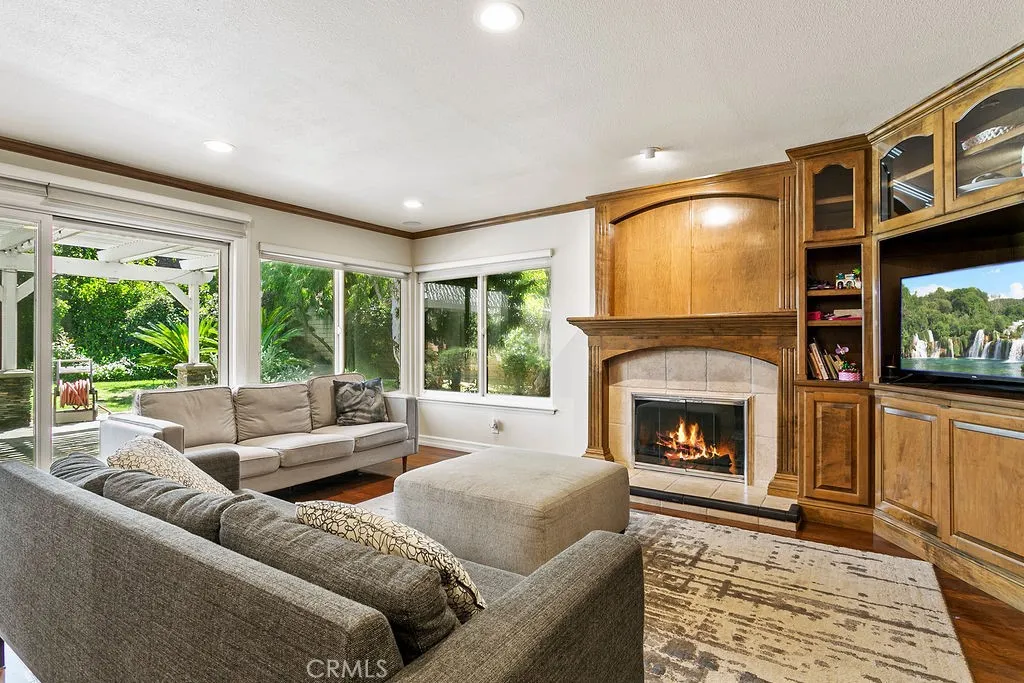 Open to the kitchen, the spacious family room is warm and inviting with matching pecan cabinetry, rich wood flooring, a stone fireplace, and recessed lighting. A sliding glass door extends the living space outdoors to a truly one-of-a-kind backyard retreat. Designed for year-round entertaining, it boasts exquisite hardscape, lush greenery, detailed stonework, and a large covered gazebo complete with an outdoor fireplace and TV.