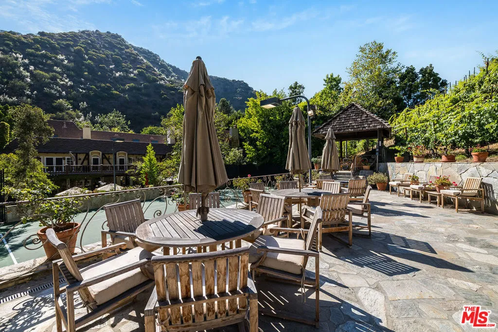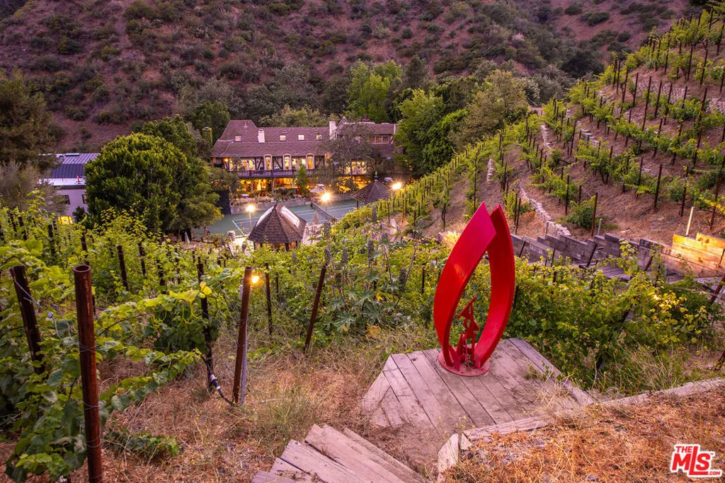 Behind the gates of the exclusive guard gated Moraga Estates in Bel Air, this extraordinary 6-bedroom Traditional “storybook-style” estate blends European charm with California luxury on an approximately 83,328 sf lot, or just under 2 acres. The main house spans over 9,500 sf and is a true showcase of architectural beauty and refined living. Nestled on a sprawling lot with mature vines of Cabernet Sauvignon and Sauvignon Blanc, the property offers a rare combination of elegance, enchantment, and serenity. The main level of the home features a beautiful formal living room with fireplace, a built-in bar, and a magnificent library fit for royalty, fully clad in rich wood paneling with built-ins, coffered ceilings, and a grand fireplace. A spacious family room with fireplace, a grand foyer with a stunning spiral staircase, and a formal dining room adorned with two-story leaded and stained-glass windows fill the home with warmth and light. The expansive gourmet kitchen includes a long eat-in center island, professional-grade appliances, and a sunny breakfast room that opens directly to the central courtyard with a fountain and an outdoor kitchen complete with built-in barbecue and generous island seating. The architectural details evoke timeless romance – arched doorways, steep pitched roofs, and ivy-draped stonework – creating a home that feels both majestic and magical. The exquisitely landscaped grounds are lush with mature trees and greenery that provide both shade and privacy. A full-size tennis court includes a viewing pavilion above, perfect for entertaining. The massive primary suite is a luxurious retreat, offering a fireplace, large private balcony overlooking the pool and gardens, dual custom walk-in closets, and a spa-quality marble bath with steam shower, sauna, separate soaking tub, multiple vanities, and even a barber’s chair. Additional features include an attached 3-car garage and approximately 4,500 sq. ft. of bonus space with endless possibilities. The space once housed the world’s largest antique slot machine collection and is outfitted with extensive built-in shelving and display cases ideal for showcasing any large collection. It also includes an incredible custom train room, making it a dream for hobbyists or collectors. Whether envisioned as a screening room, game parlor, gym, or creative studio, this one-of-a-kind space offers unmatched potential. The property also offers a pool, spa, koi pond, formal garden, and a custom wine cellar carved into the hillside. Offered fully furnished for a seamless move-in or investment opportunity, this magical estate is tucked away in one of Bel Air’s only 24/7 guard-gated communities – just minutes from Brentwood, Beverly Hills, and top-tier schools. A rare opportunity to own a legacy estate that offers scale, serenity, and timeless elegance.
