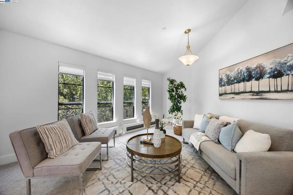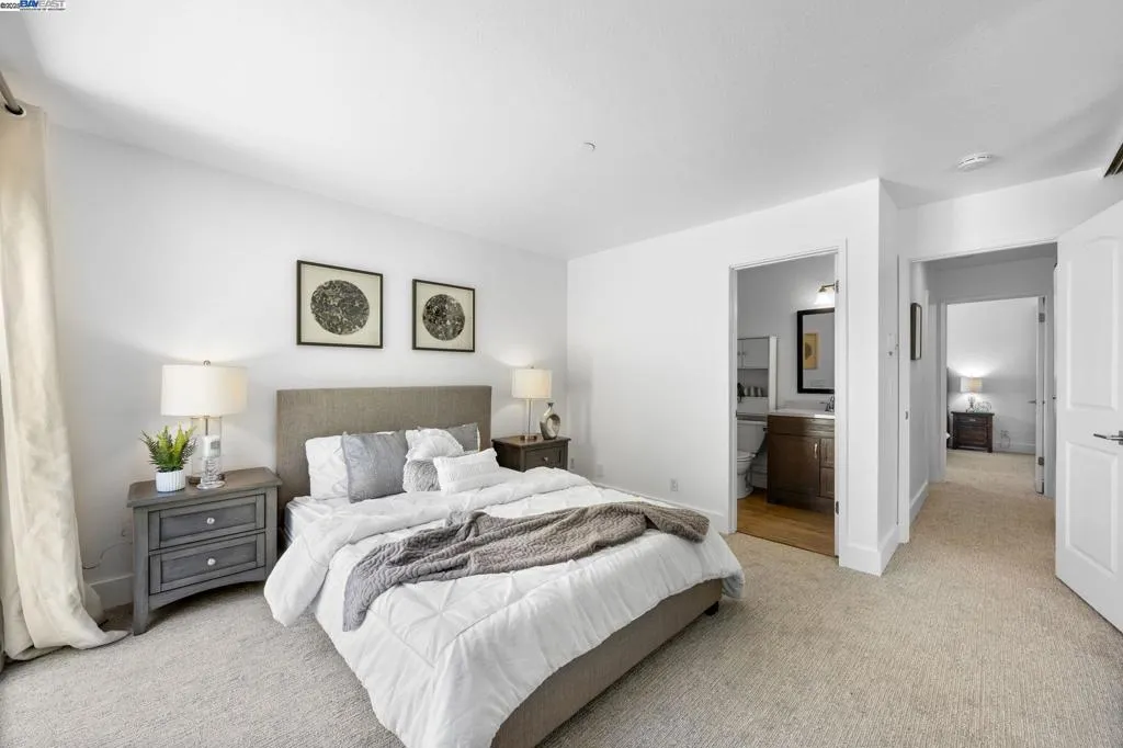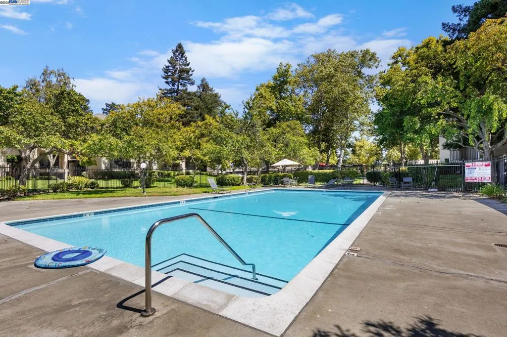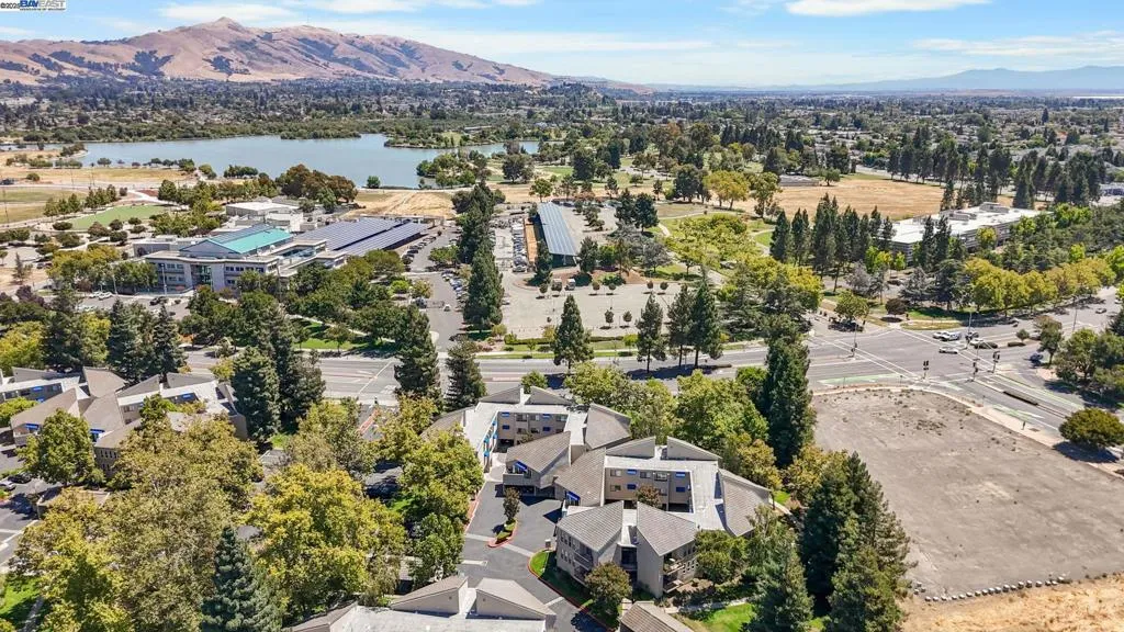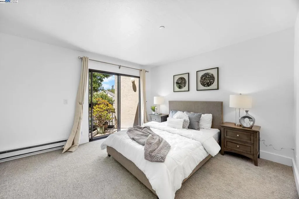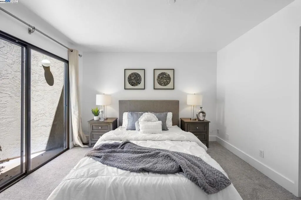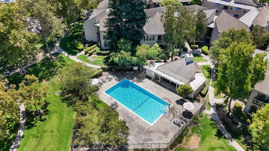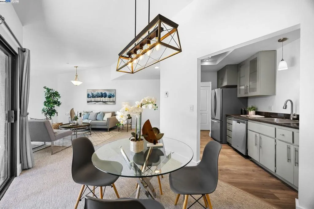 Light-filled interiors meet modern comfort in this thoughtfully designed 2 bedrooms and 2 bathrooms Fremont condo. Vaulted ceilings, neutral tones, and updated finishes create a calm, elevated aesthetic. Enjoy seamless indoor-outdoor flow from your living room to a private balcony framed by trees. The open dining area sits beneath a sculptural light fixture, while the sleek kitchen offers stainless appliances and clean lines. Both bedrooms are restful retreats, with soft carpet and abundant natural light. Community amenities include lush greenbelts, a sparkling pool, walking paths, and picnic areas. Located near Lake Elizabeth, BART, and major tech hubs. Live simply. Live beautifully.