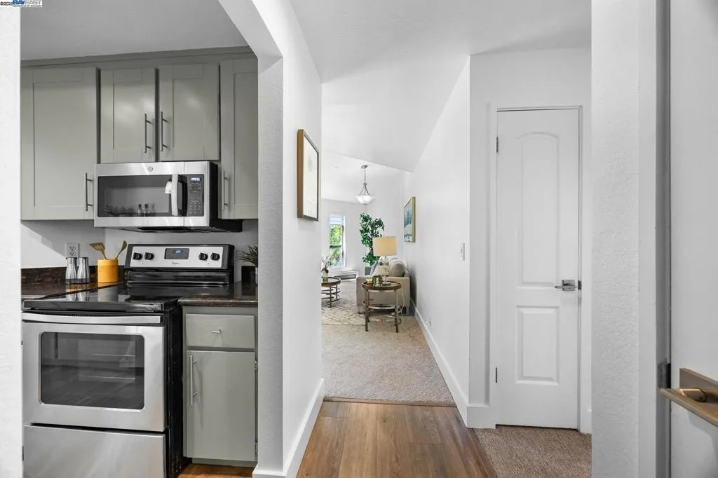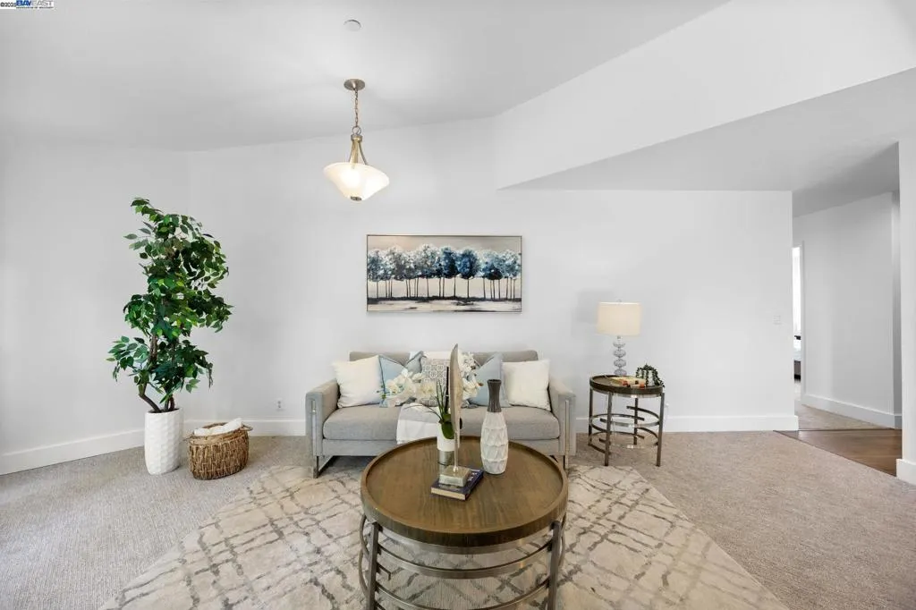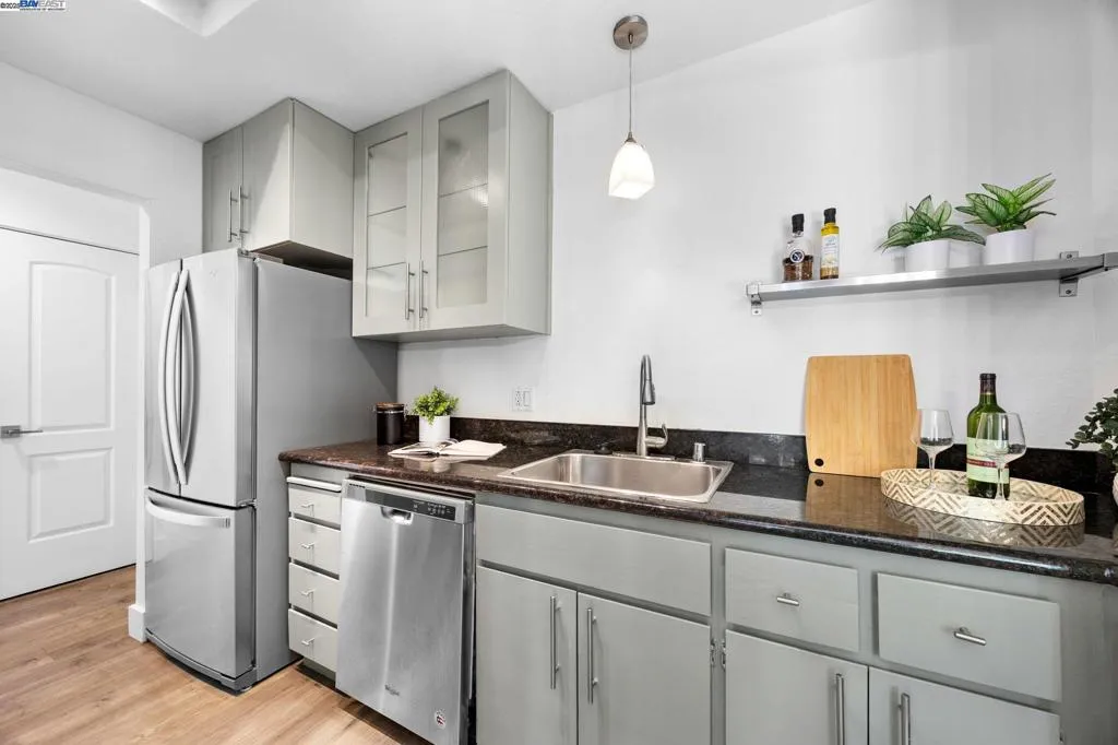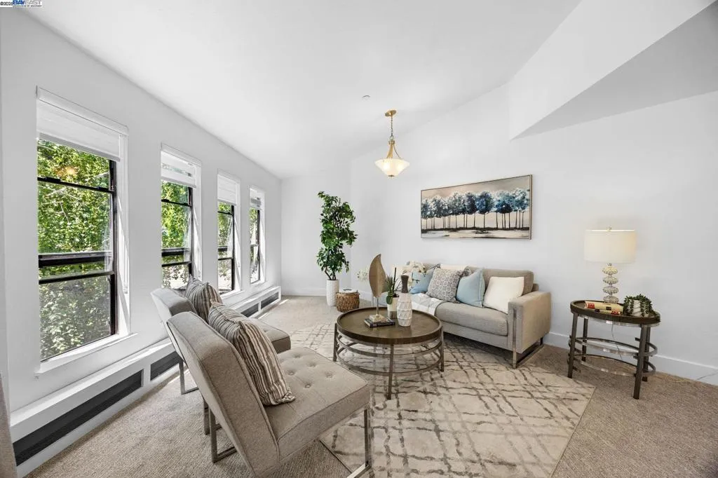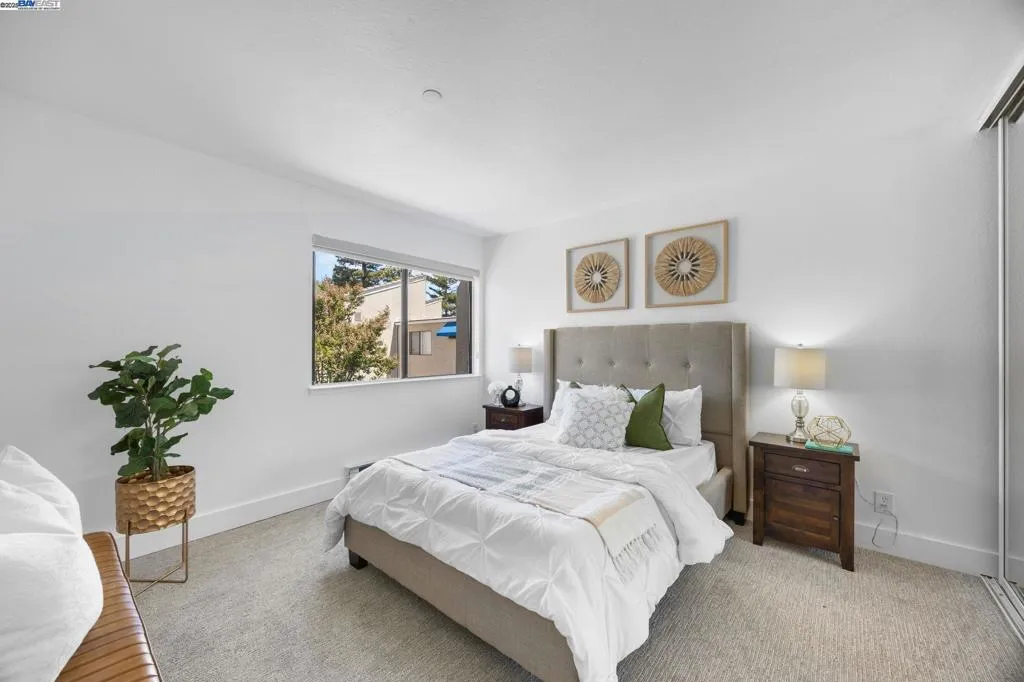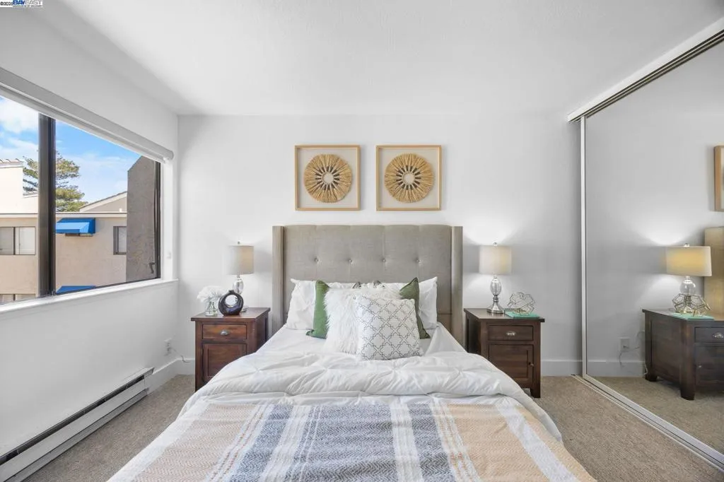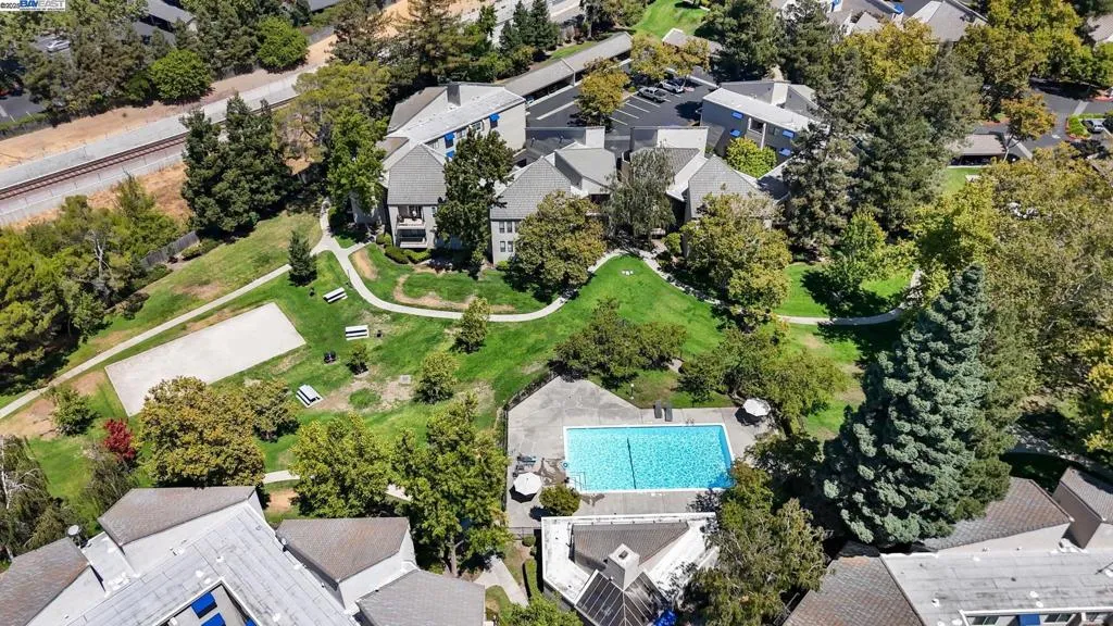 Light-filled interiors meet modern comfort in this thoughtfully designed 2 bedrooms and 2 bathrooms Fremont condo. Vaulted ceilings, neutral tones, and updated finishes create a calm, elevated aesthetic. Enjoy seamless indoor-outdoor flow from your living room to a private balcony framed by trees. The open dining area sits beneath a sculptural light fixture, while the sleek kitchen offers stainless appliances and clean lines. Both bedrooms are restful retreats, with soft carpet and abundant natural light. Community amenities include lush greenbelts, a sparkling pool, walking paths, and picnic areas. Located near Lake Elizabeth, BART, and major tech hubs. Live simply. Live beautifully.