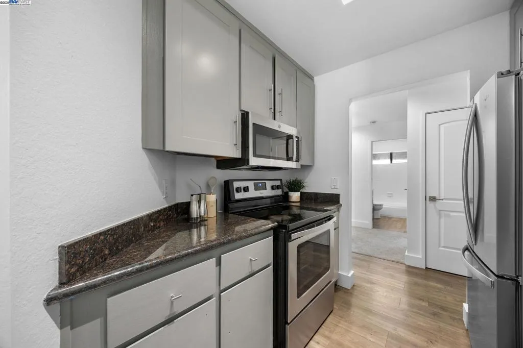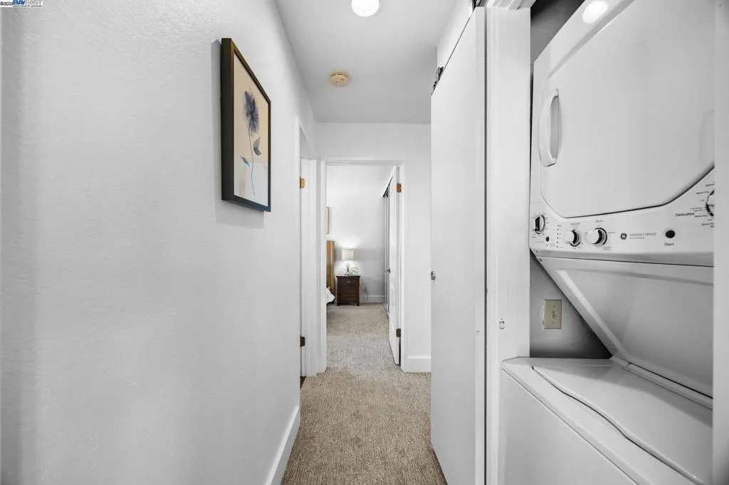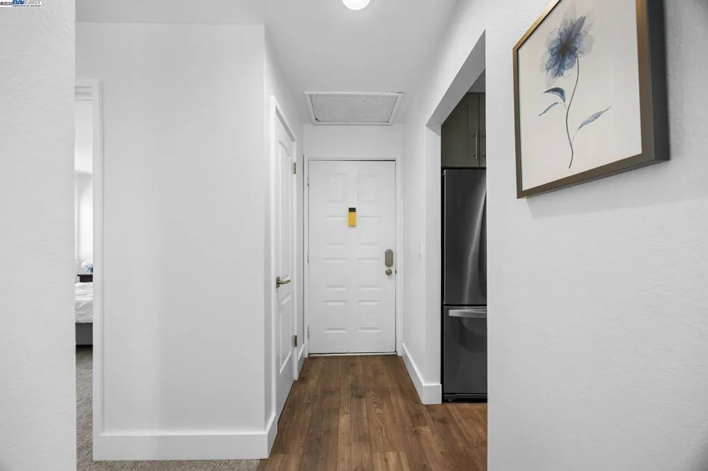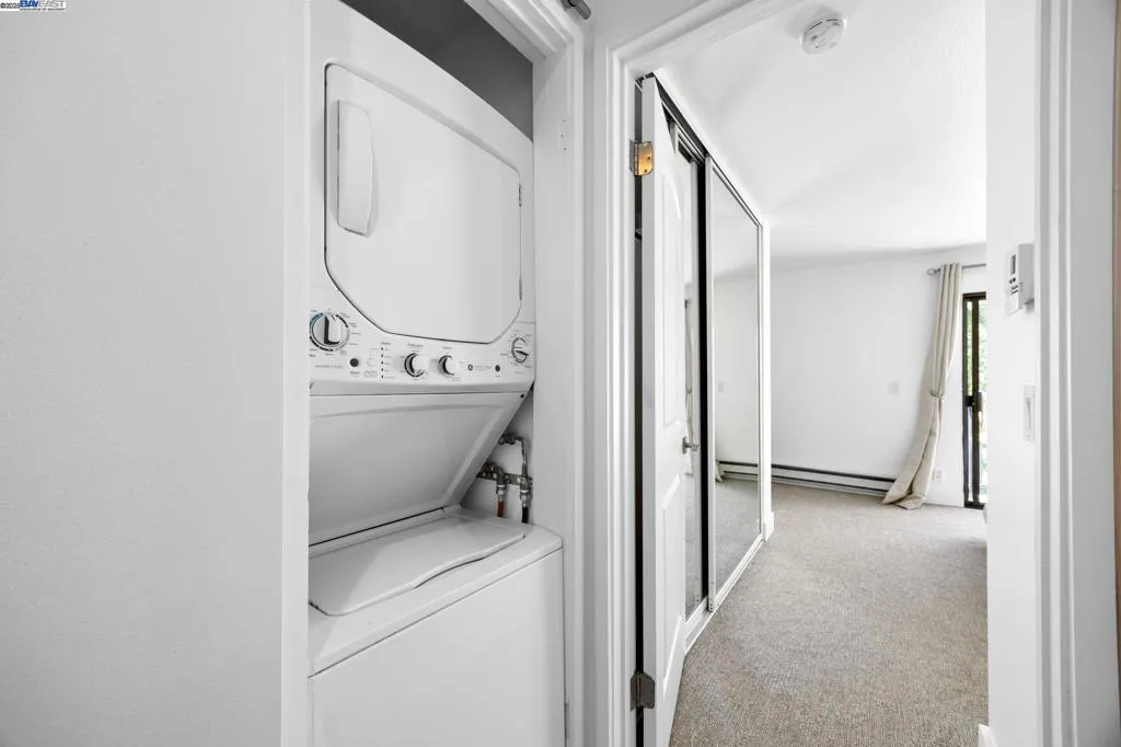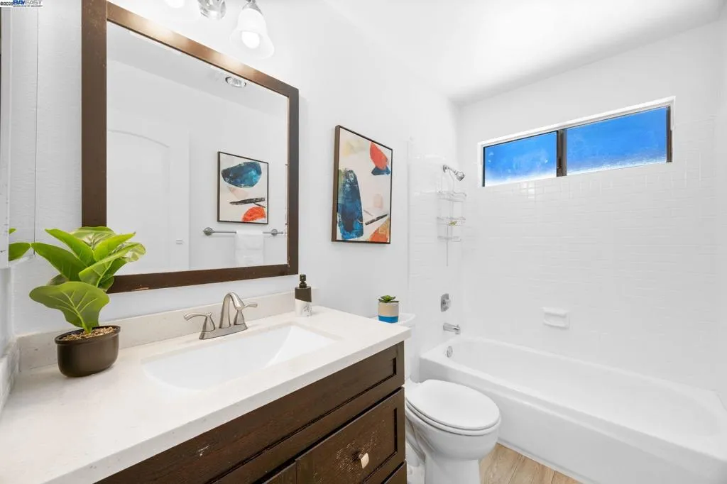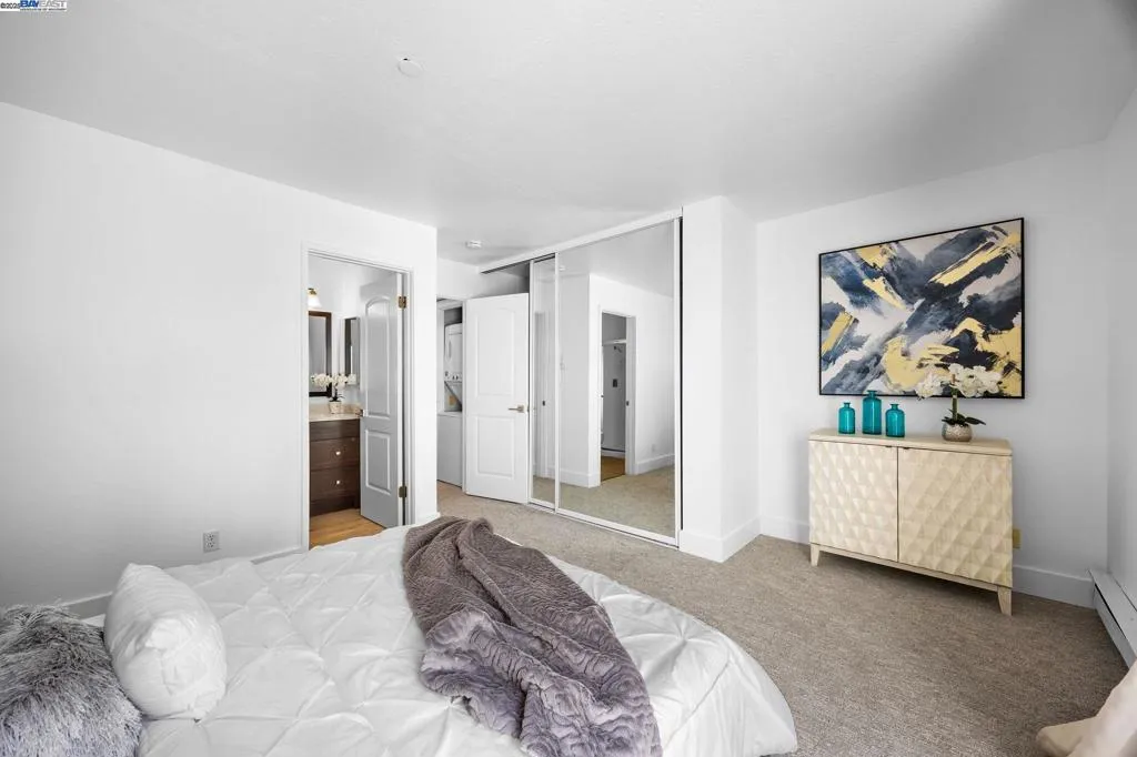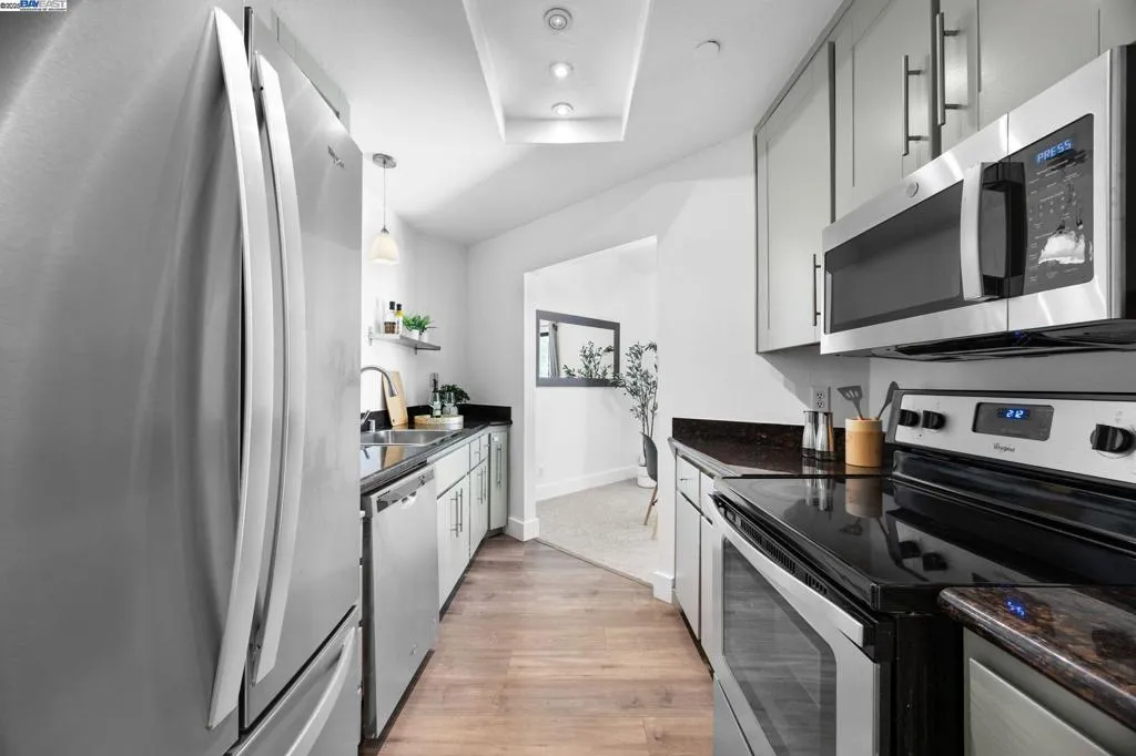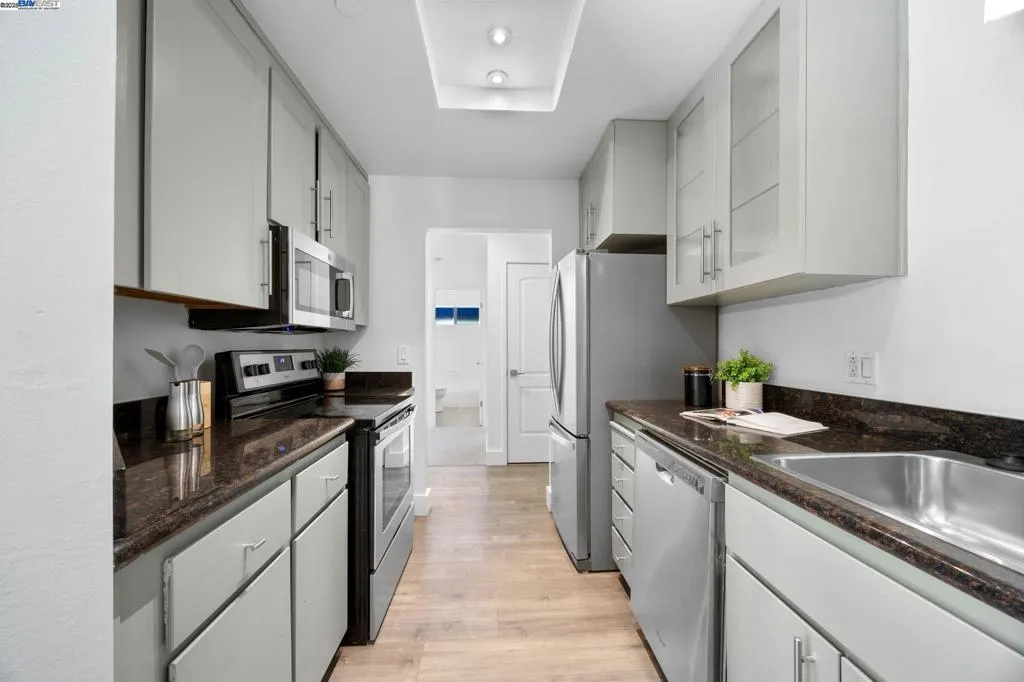 Light-filled interiors meet modern comfort in this thoughtfully designed 2 bedrooms and 2 bathrooms Fremont condo. Vaulted ceilings, neutral tones, and updated finishes create a calm, elevated aesthetic. Enjoy seamless indoor-outdoor flow from your living room to a private balcony framed by trees. The open dining area sits beneath a sculptural light fixture, while the sleek kitchen offers stainless appliances and clean lines. Both bedrooms are restful retreats, with soft carpet and abundant natural light. Community amenities include lush greenbelts, a sparkling pool, walking paths, and picnic areas. Located near Lake Elizabeth, BART, and major tech hubs. Live simply. Live beautifully.