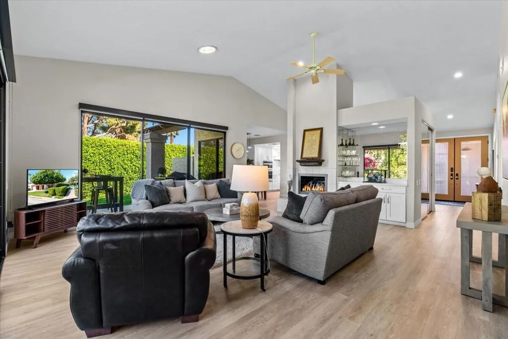 Nestled between the world famous La Quinta Resort and Old Town, this tastefully remodeled end unit is the perfect location. VIRTUAL TOUR, copy/paste your browser: https://my.matterport.com/show/?m=yxuGWSfcLyA&mls=1 . Private gated entry courtyard greets you with beautiful landscaping and lounging fire pit area that’s fully enclosed for pet and family enjoyment. Inside you’ll discover a fully remodeled 2-bedroom condo with vaulted ceilings, new floors, baseboards, cabinetry, kitchen, bathrooms, quartz counters, laundry, appliances, dual primary closets, and custom built-in storage. Step outside and extend your living space with patios off of the primary bedroom, dining area, and great room; each offering views of the Santa Rosa Mountains while backing onto a private greenbelt. The two-car plus separate golf cart garage features raised flooring and storage. Enjoy desert living in this lifestyle unit.