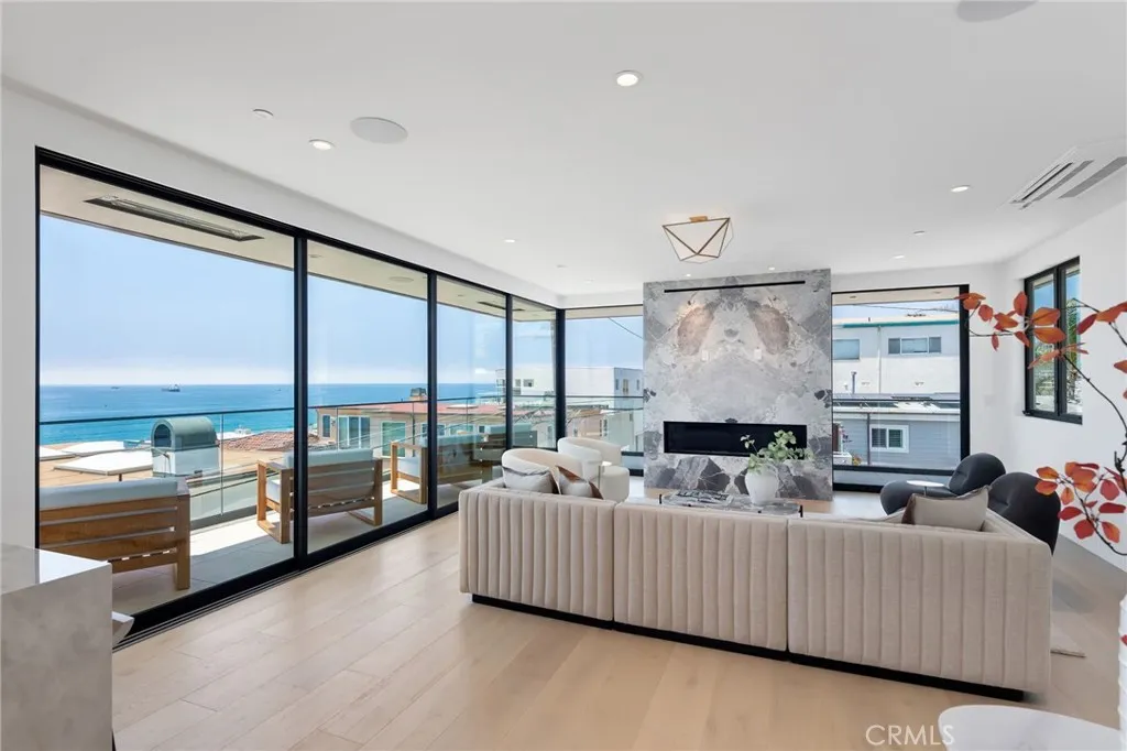 Introducing an unparalleled coastal masterpiece where modern elegance meets breathtaking ocean and whitewater vistas that must be seen to be believed. Situated on a prime corner lot with 4322sf of living space, this newly constructed residence seamlessly blends indoor and outdoor living spaces for ultimate Southern California luxury. Almost all of the 84 ocean-facing feet of the upper level are framed by Fleetwood doors and windows which truly capture the stunning panoramic ocean views from Palos Verdes and Catalina Island all the way to Malibu. This is by far one of the finest homes built in Manhattan Beach! The gourmet kitchen, equipped with state-of-the-art appliances and white oak cabinetry, flows effortlessly into the spacious living and dining areas, making it perfect for both intimate gatherings and grand entertaining. The primary suite serves as a spa-like sanctuary, featuring a steam shower, Venetian plaster walls, two-sided fireplace, and a generous walk-in closet. Additional four junior suites are masterfully designed, each with en-suite bathrooms and ample closet space. The expansive decks provide a serene setting for sunset views over the ocean, while the outdoor living area on the walkstreet offers ultimate relaxation and entertainment. Situated just steps from the beach, this property provides convenient access to upscale dining, boutique shopping, and top-rated schools. The corner location of this home allows for the key advantages of capturing up to 2 extra feet of width for the home, much more natural light, and much better views.