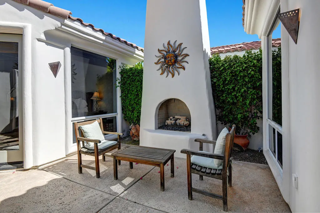Stunning south-facing Valencia Plan 2 home in The Citrus community, perfectly situated on the 8th fairway with breathtaking mountain views. This beautifully remodeled home, offered fully furnished, blends elegance with modern updates and a highly desirable layout.Featuring 3 bedrooms plus a den/office and 3.5 bathrooms, this home includes a detached casita, perfect for guests. The inviting center courtyard with a built-in fireplace creates a warm and welcoming ambiance. The outdoor backyard space is ideal for relaxing and enjoying the picturesque golf course and mountain views, complete with retractable awnings for added shade and comfort.A major renovation in 2022 enhanced the home’s style and functionality, including new kitchen countertops, sink, faucet, garbage disposal, backsplash, a new microwave oven, and a new refrigerator. The powder room was updated with a new countertop, sink, and faucet, while the bar area also received a new countertop, sink, and faucet.Located in the private, guard-gated Citrus community, this move-in-ready home offers the perfect blend of luxury, comfort, and breathtaking surroundings. Don’t miss this incredible opportunity to own in one of La Quinta’s premier communities!