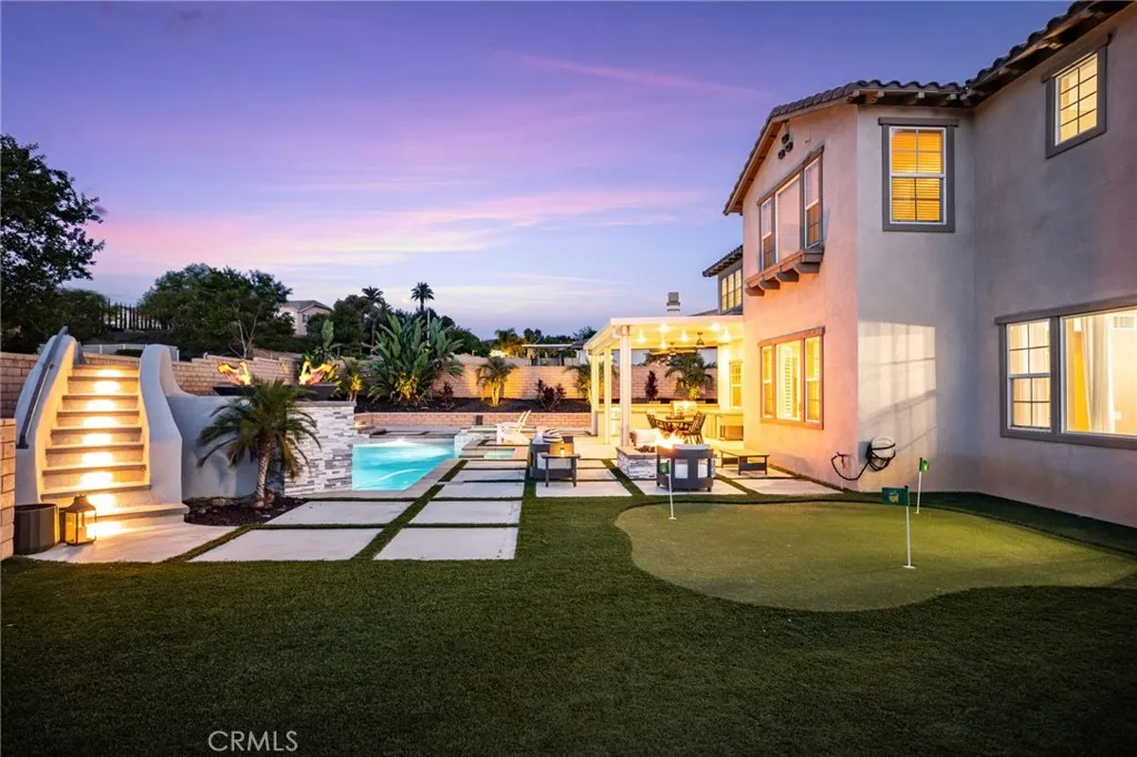 Upstairs, the primary suite offers dual walk-in closets, jacuzzi tub, walk-in shower, dual vanities, and elegant wall moldings. Additional features include a loft (easily converted to a 6th bedroom), 3 more bedrooms, 2 full baths, and an oversized laundry room with utility sink. Enjoy indoor/outdoor living with a fully upgraded backyard featuring a newer pool with waterslide, spa, built-in BBQ, Teppanyaki grill, refrigerator, firepit, covered patio, backyard speakers, and a putting green.Bonus features: 220V in garages, Solar, RV access/parking, 4-car tandem garage, surround sound wiring, low taxes, and convenient access to the 91 Freeway, Tyler Mall, restaurants, Kaiser Hospital, and Metrolink.
