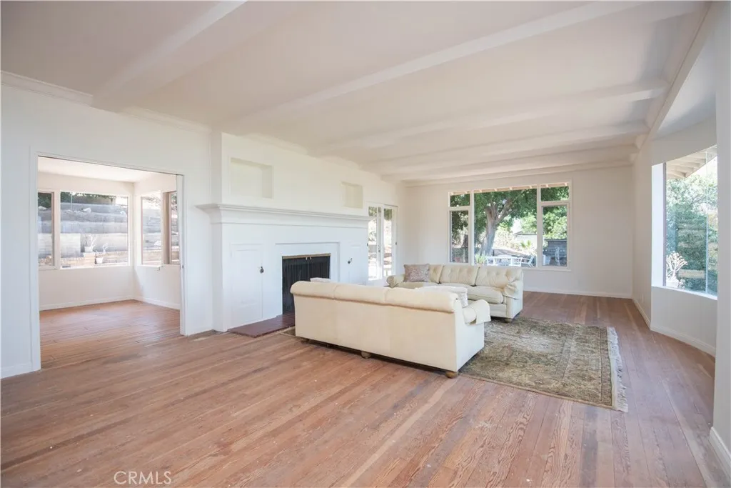 The formal living room boasts wood flooring, a beamed ceiling, a wood-burning fireplace, and a panoramic bowed window with paneled glass.