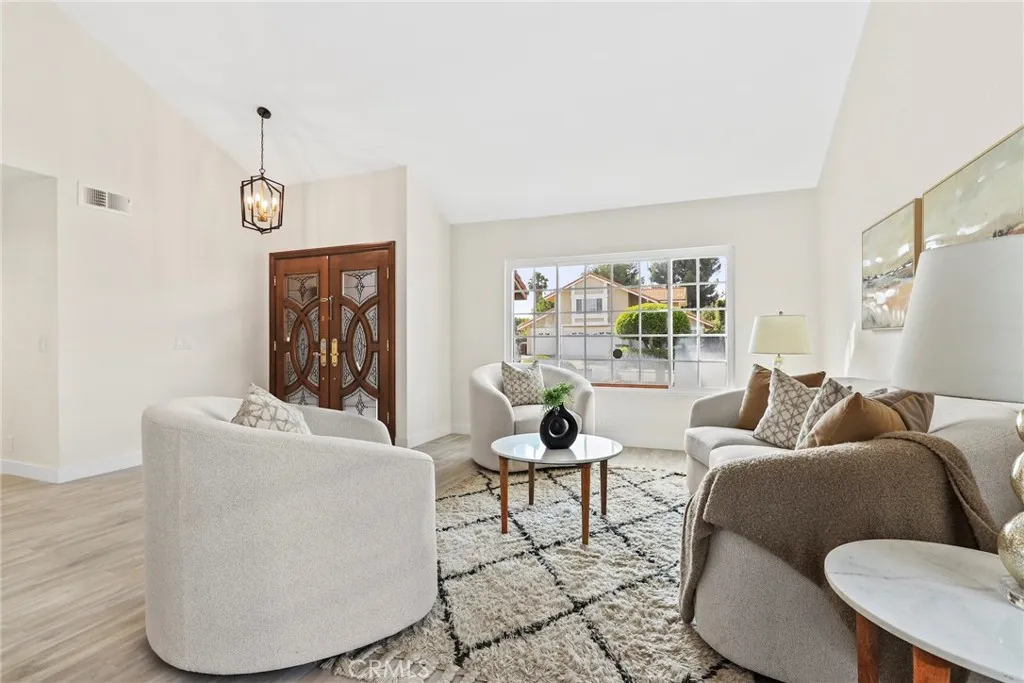 Grand Living Room: Double-door entry and dramatic ceilings create a bright, open, and welcoming atmosphere.