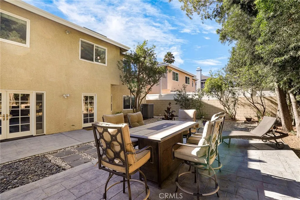 Step into the inviting, sun-filled living room with soaring ceilings, then flow into the formal dining room and gourmet kitchen featuring granite countertops and stainless-steel appliances. The cozy family room, complete with a custom fireplace, opens to your private backyard oasis — perfect for relaxing or entertaining.